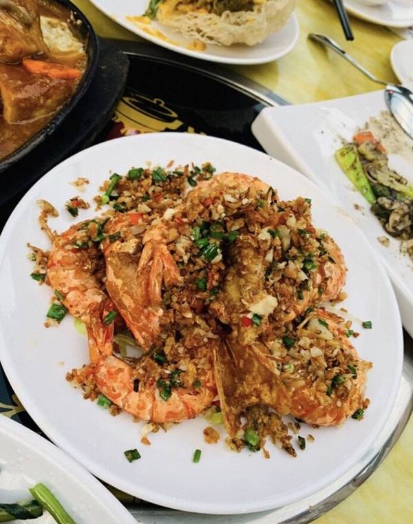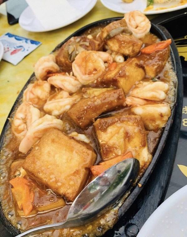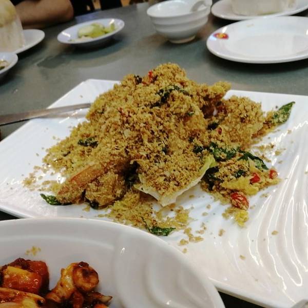尤其推 荐「咸蛋黄鱼皮」咸 蛋鱼皮是新加坡的特色,蛋黄味很足,刚刚炸好的蛋黄鱼皮,很脆,还很好吃,大虾配的酱是店家自己调的秘密酱汁,真的很好吃!