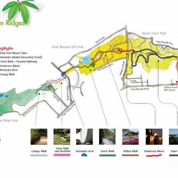 harbourfront地铁站D出口沿Marang Road上山,很快就能到花柏山,再继续走到 Henderson Waves,Hilltop,Canopy以及Forest Walks, Alexandra Arch,到hort park, Kent Ridge Park ,最后穿过science park到达 Kent Ridge地铁站终点。全程路标清晰,唯有science park到地铁站没什么指示。