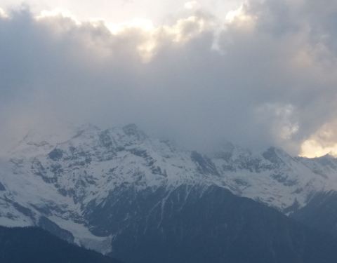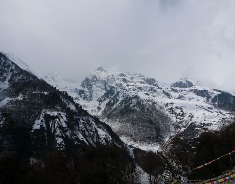 窗外就是大大的雪山,我们八点要出发,七点多就必须起床,所以这个日照金顶看不看已经由不得我们选择,因为一睁眼就能看到,近在咫尺的感觉。因为前一天都是上坡路为多,脚意外地没有冷痛。今天的行程就是冰湖,也就是翻过一座山到雪山脚下,来回24公里的山路。和我们同来的另外一队人马已经零零散散地,六人剩下3人和我们一同出发,另外两女生打算在旅馆休息,还有一大叔准备骑着毛驴进山去,后于我们出发。
