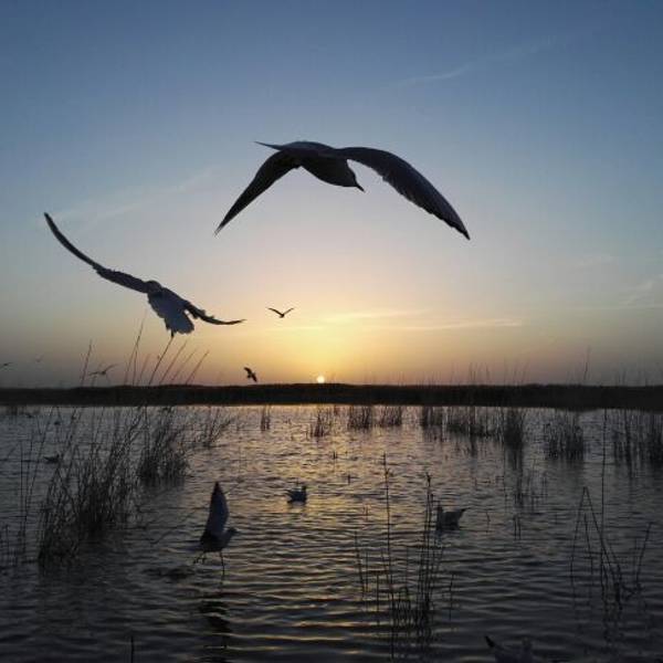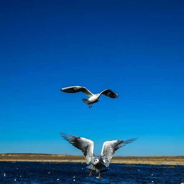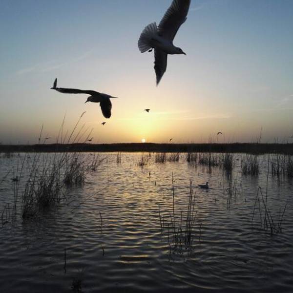 ...整个空气都暖和起来,一群群海鸥也激动地拍打着水面耀上天空,美极了的画面,连芦苇也感动的左右摇摆一、居延海