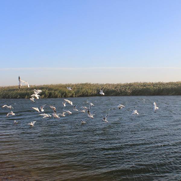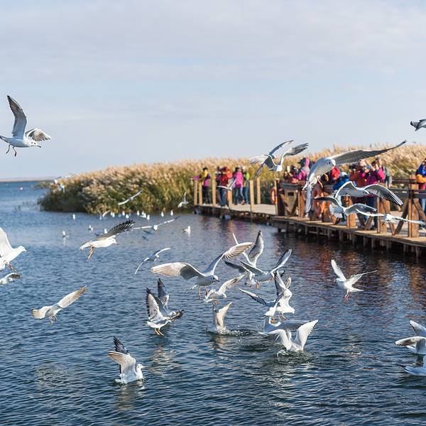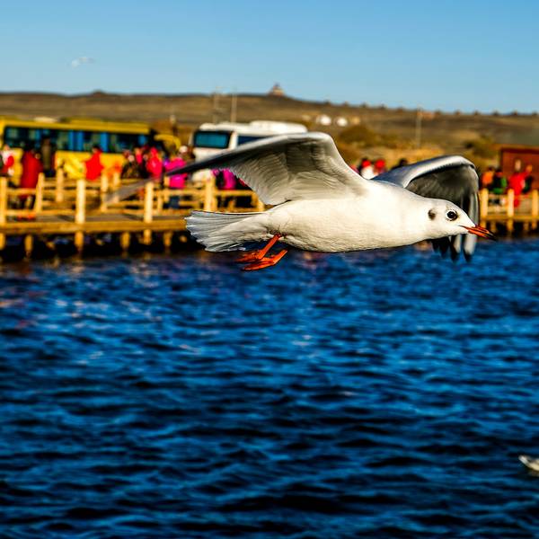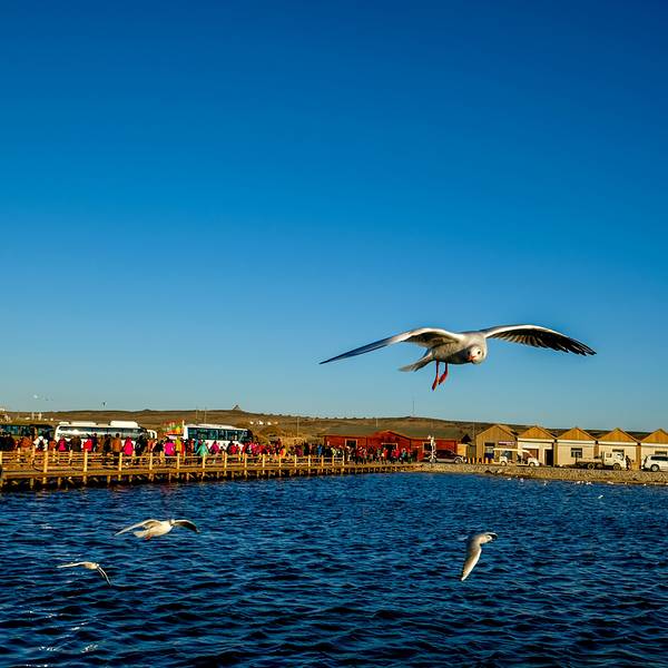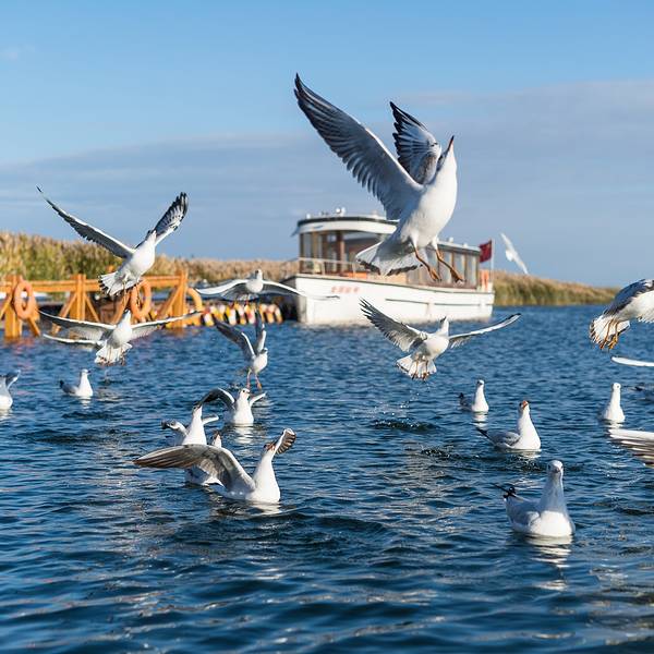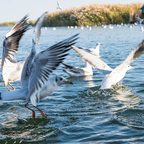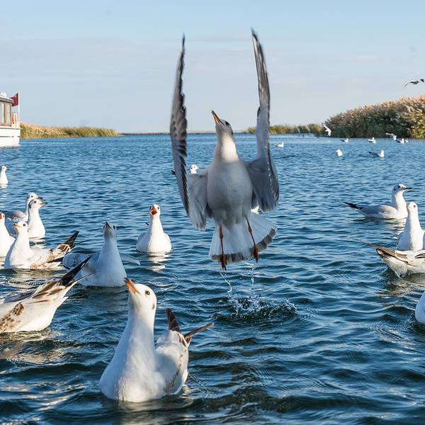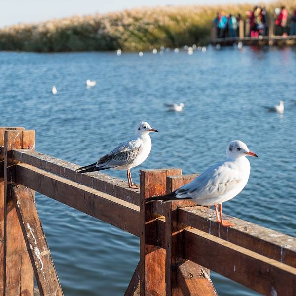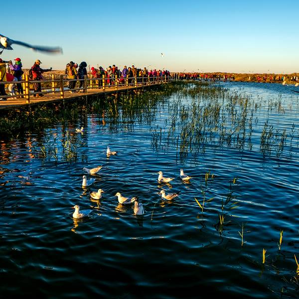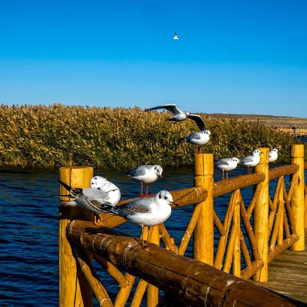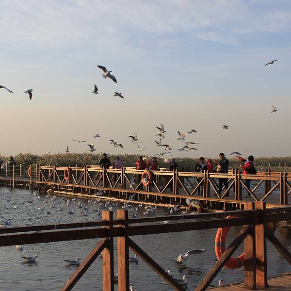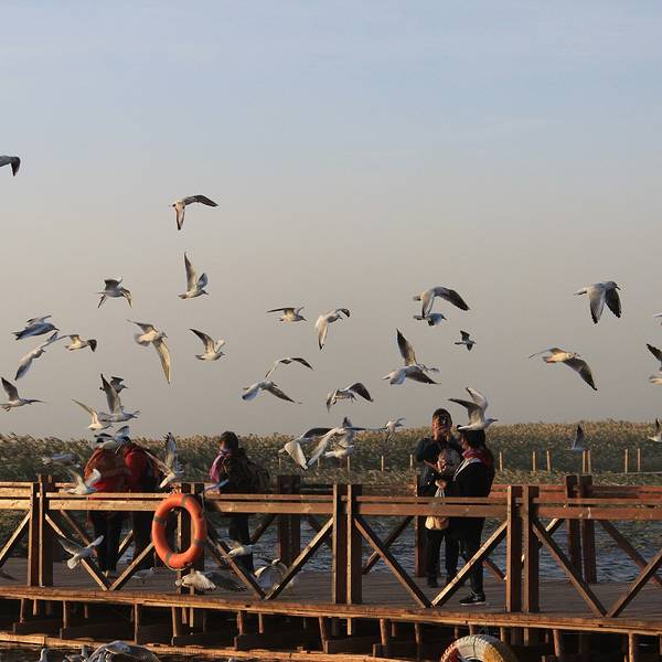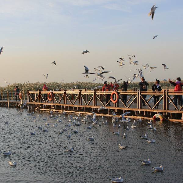 人们拿着食物引诱着海鸥在水面上忽起忽落争相拍照。湖边的芦苇很是茂盛,