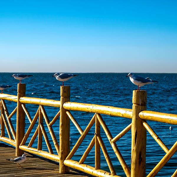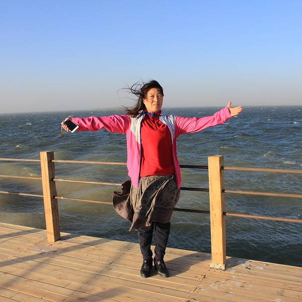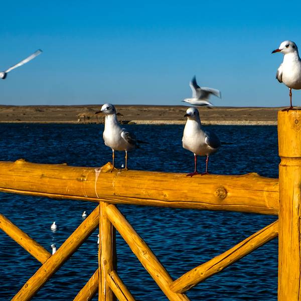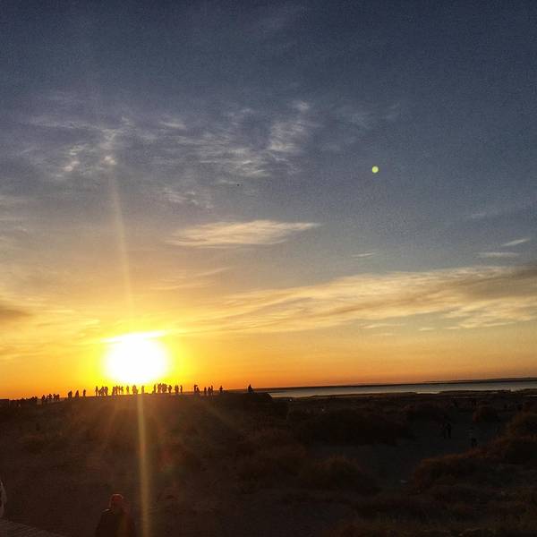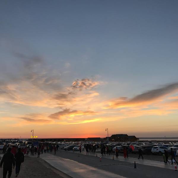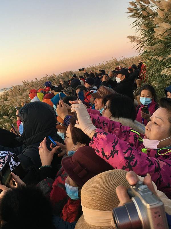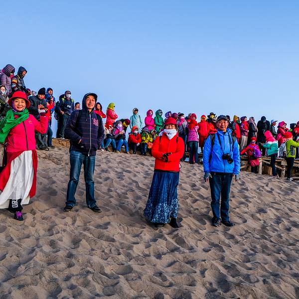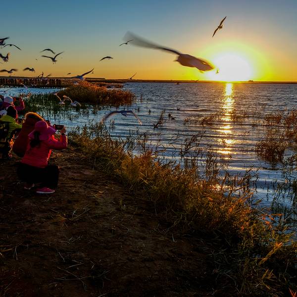 景区入口离湖边有段距离,全是沙滩,景区观光车得到了湖边才能坐,只能顶着大风跟着人群往前跑了。到了湖边,人更是多,观景台已站满了人,只能找个自己认为比较好的位置看日出了。太阳出来了,人也沸腾了,成群的海鸥或在水面,或在天空啊啊乱叫。