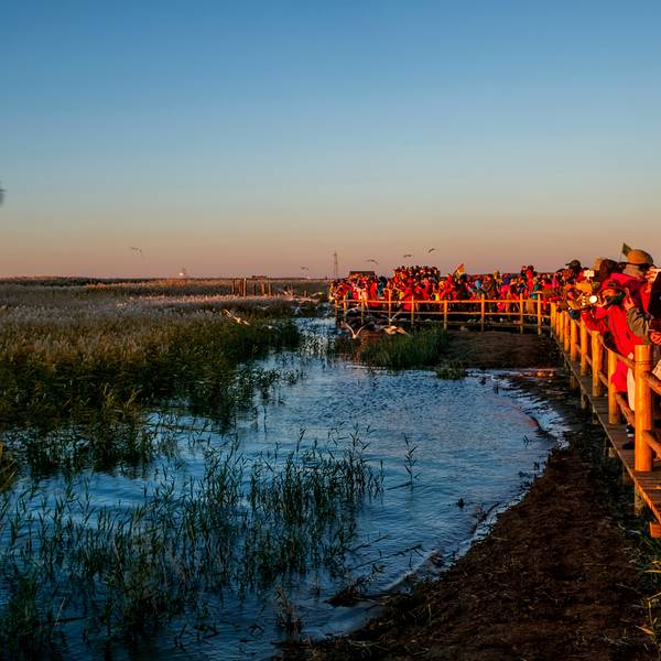 整个景区分了3个码头:鸿雁码头、东归码头、仙踪码头,码头之间有电瓶车往返。第一个主要看水鸟,第二个、第三个主要看芦苇荡。其实每个码头之间距离并不远,纯走路也完全可以的。太阳出来之前的朝霞 看看这停车场乌央乌央的车 这还只是很小一角进了景区以后再走大约1千米才是观景台,我们来不及了,就站在入口的地方看的。图上那些人才是真的等了一晚日出的。刚刚出太阳,光线还有点暗太阳刚出来 光还有点红 打在水草上 老感觉有点像夕阳下的景色丰茂的芦苇中间密密麻麻的落得都是海鸥就在第三个码头附近 老子升仙不太清楚为什么 应该是迎光与逆光的原因 有些芦苇是黄一些的颜色 有些又是这个颜色 展开