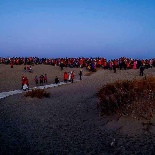 为了看日出,早上五点便从酒店出发了,外面漆黑一片,沿途风光算是没啥欣赏的了。居延海是我国第二大内陆河黑河的尾闾湖,名字源于唐朝,发源于祁连山深处的黑河。从达来呼布镇一个小时便到了居延海,不过人已经很多了。外面真是冷,可能是挨着水面的原因,当时穿了带抓绒的冲锋衣,还冷的不行。