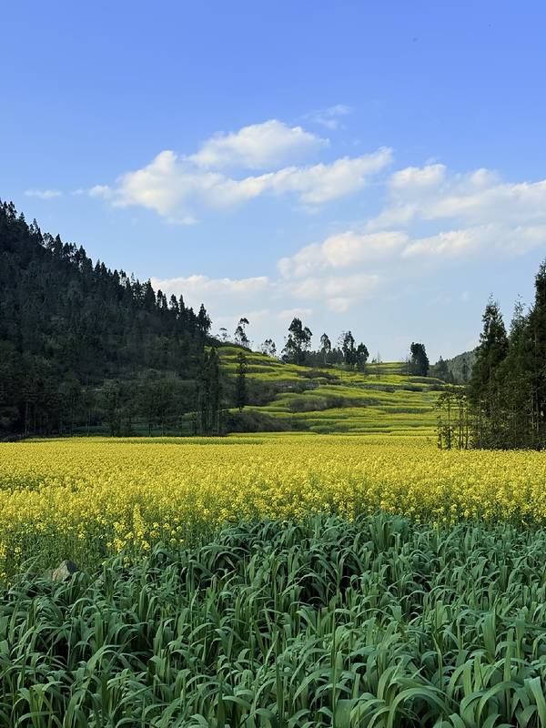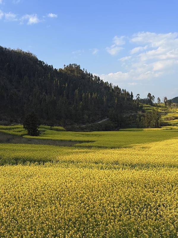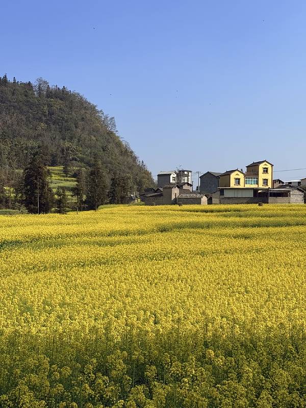 站在花海山坡上,风里全是油菜花的清甜香气,看着金黄花田铺向远方,峰林若隐若现,炊烟袅袅的村落藏在花海间,整个人都松弛下来了。