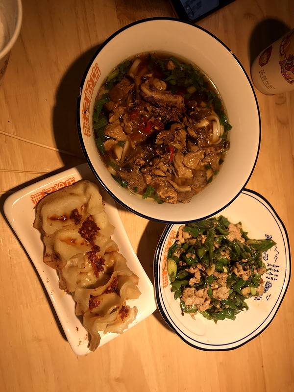 - 真是赚到了。路边随手买的小串串也好好吃!煎饺好吃!辣椒炒肉好吃!无名泡粉好吃!人总是贪心的