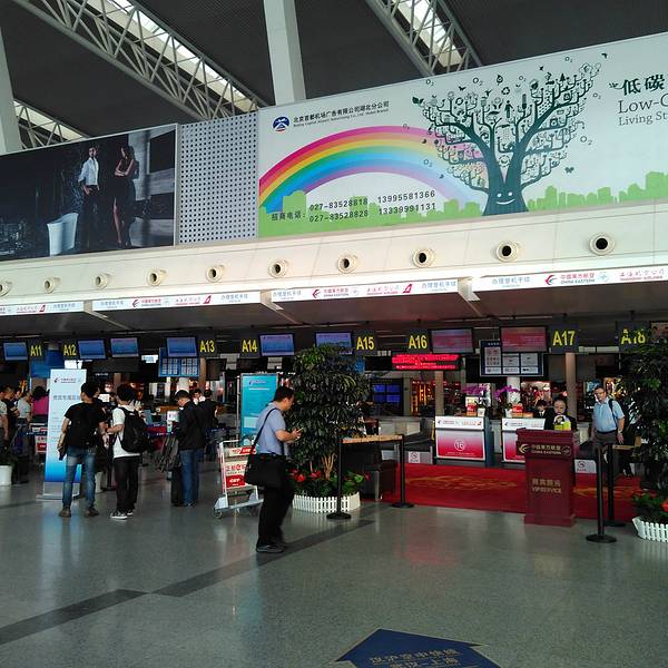 机场服务:机场有分A区跟B区, 主要A区是给东航跟国航来使用, B区给南航,厦航等航空来使用。当然还有许多的自助值机柜台可以加速你的值机手续, 还有每个区域每有各航空公司的专属VIP通道。 机场中间还有个询问台。 机场内1F很多高档名牌小商店, 可以买一些临时忘了带的东西, 或这买东西送人, 2F有很多的连锁餐厅, 价钱不会贵的离谱, 值的一提的是, 有很多鸭脖店,比如周黑鸭, 我想可能是武汉的特产吧。