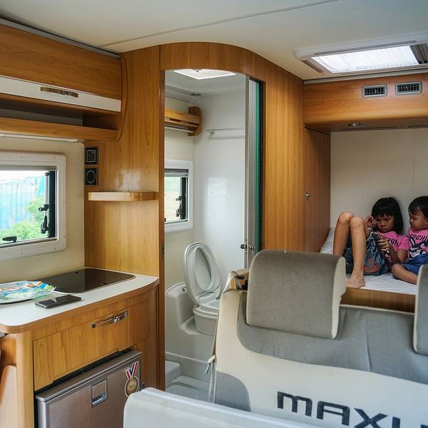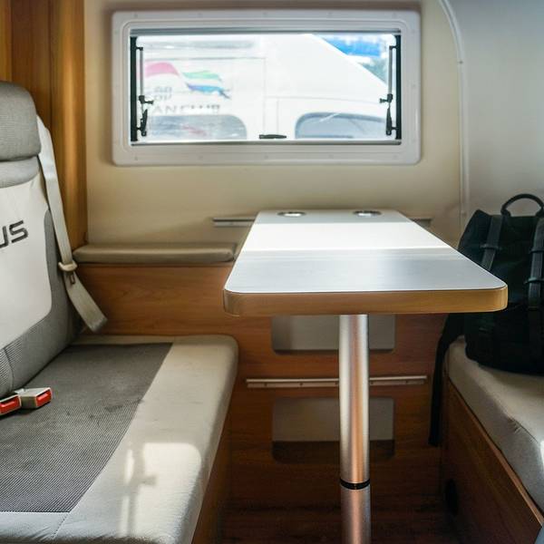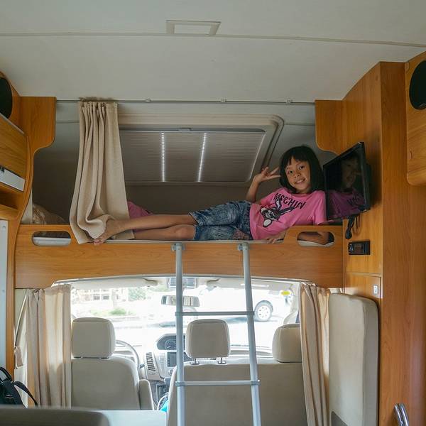 是啊,躺在这个位置之上,打开天窗就能看到星星,连我都想要躺在那里呢!我们这一次租的是可容纳5个人的房车,车顶和车尾各有一张双人床,用餐区域也可以把桌子放下转换成一张沙发床。房车内带有厨房和卫浴,电视、冰箱等设备,特别适合像我们这样带小孩的家庭。这个小桌子可以拆下来,再铺上座垫,就是一张沙发床啦!办好手续,直奔市区。