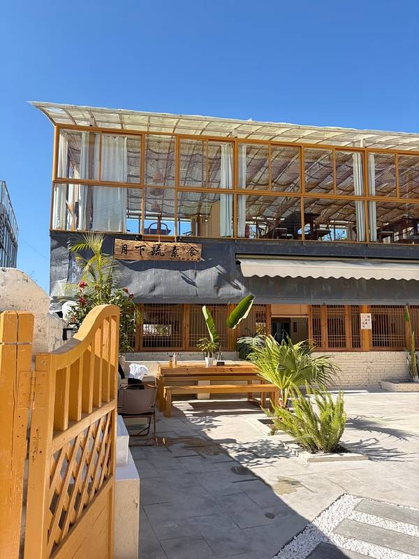 - 「月下蔬素食」的木质庭院,玻璃顶+木桌椅,新中式穿搭拍出来温柔到骨子里;