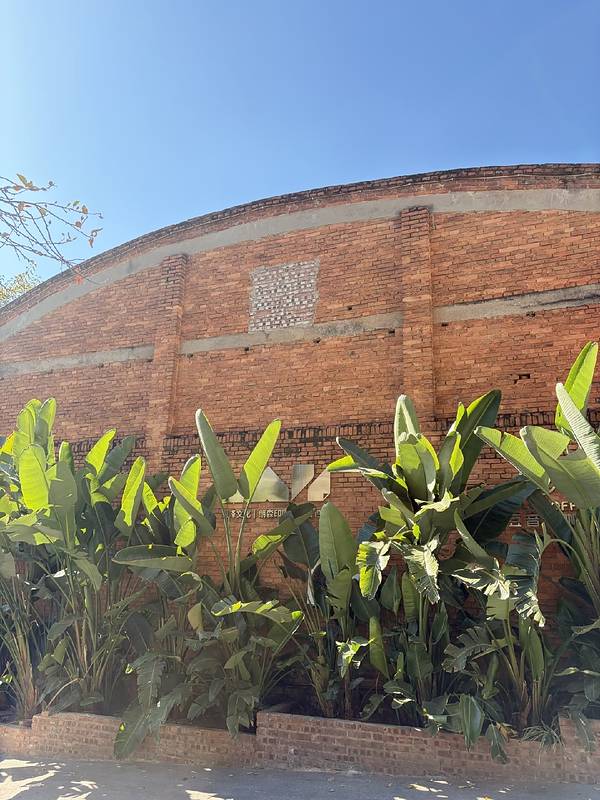 - 弧形红砖墙前的热带芭蕉林,仰拍就是复古工业风大片,阳光洒在砖墙上的光影氛围感拉满;