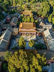 1. 航拍视角:高空俯瞰整片寺院,橙黄琉璃瓦在青山映衬下格外亮眼,殿宇错落对称,氛围感直接拉满,大气又震撼