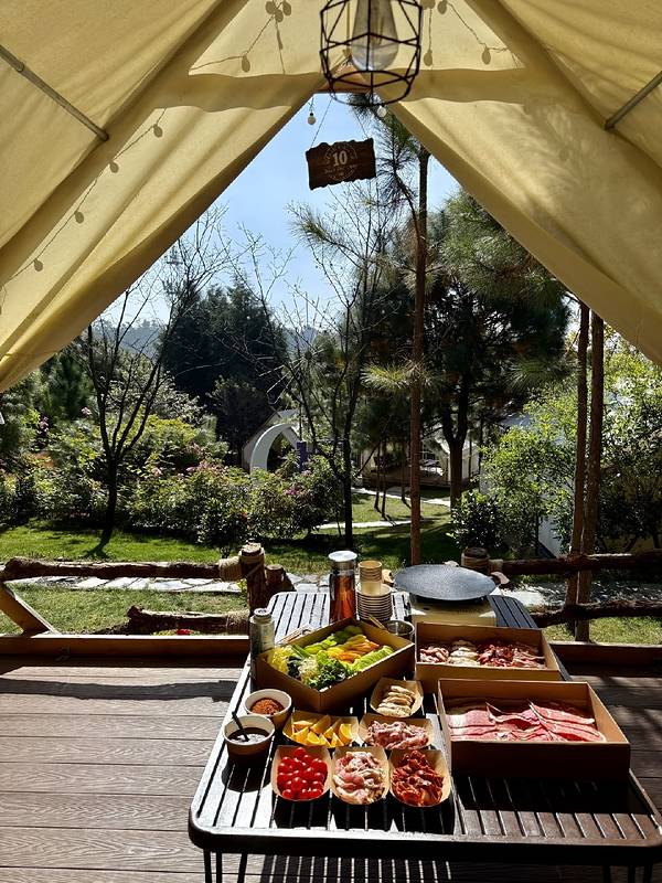 主打一站式露营烤肉套餐,不用自备装备和食材,拎包就能玩超省心!林间独立帐篷位私密性很好,烤肉食材品类丰富新鲜,荤素搭配齐全,山野里炭火烤肉滋滋飘香,边吹山林清风边聚餐闲聊,惬意又解压😋