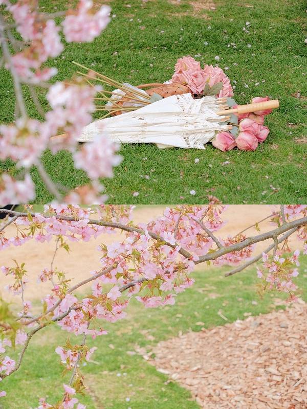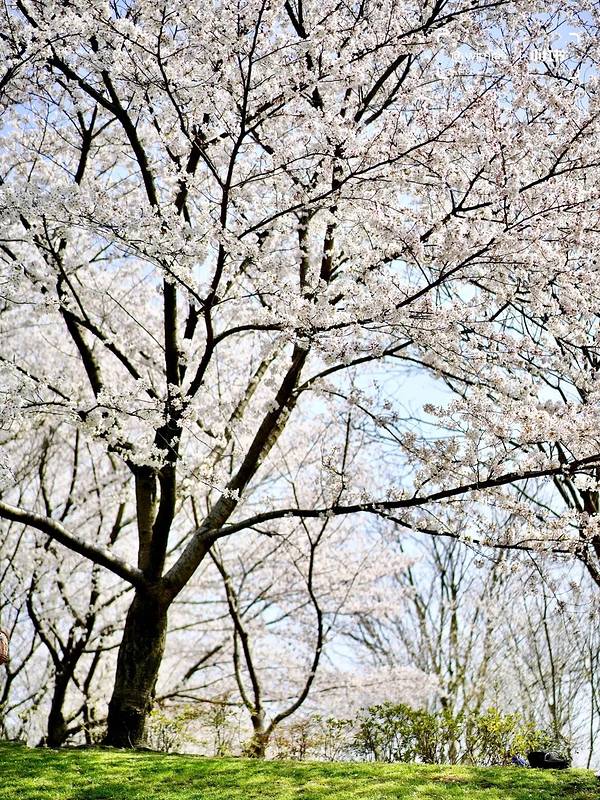 ❷站在坡上俯瞰,草坪与樱花相映成画,背景更纯净。