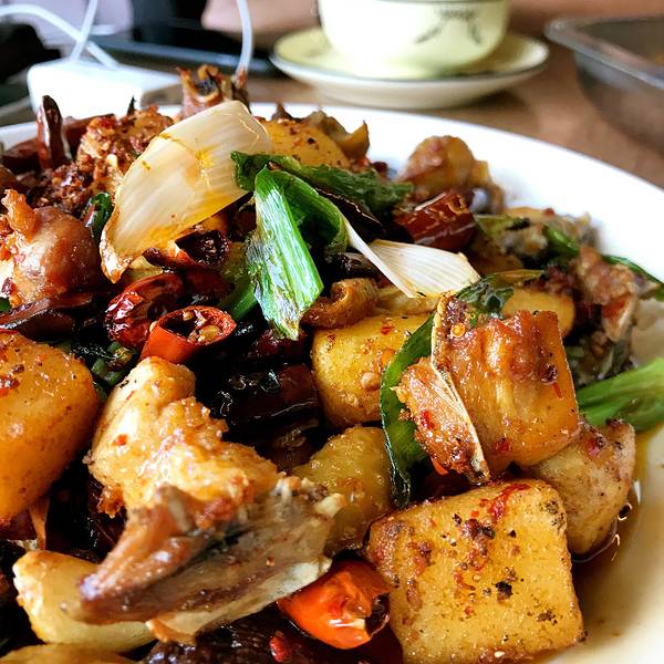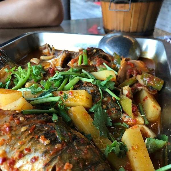 安顿好之后,我们开车去到镇上觅食。找到一家吃烧烤的地方。大理当地人喜欢吃辣,我们点的时候并没有问,但是菜上来全部放了辣椒。不过味道很不错。