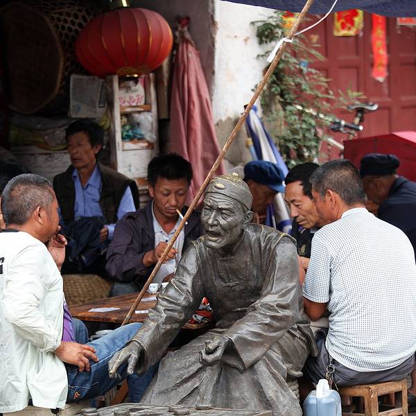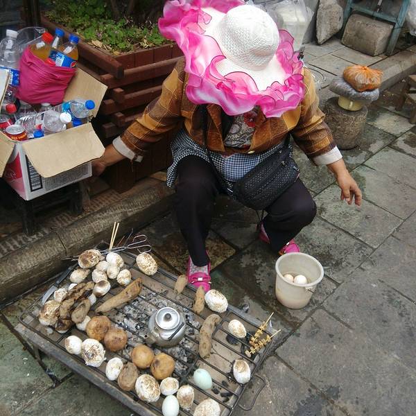 游客不多,三三两两的。当地人在路边,卖着东边山或西边山里来的香菇、野菜,泛着山野的原始气息。老茶馆里聚满了当地的茶客,一派悠闲。理发店、冥器铺、棺材铺、裁缝铺、药铺、马店、补鞋店、中医堂、杂货店、米铺……这些在外面已经基本绝迹的店铺依然在营业,店主昏昏欲睡,绝不主动招徕客人。古城中心的拱辰楼是巍山古城的标志性建筑,这个古城,以拱辰楼为中心,呈标准的井字结构建设,共有25条街道,18条巷,是中国保存最完好的明清古建筑群之一。