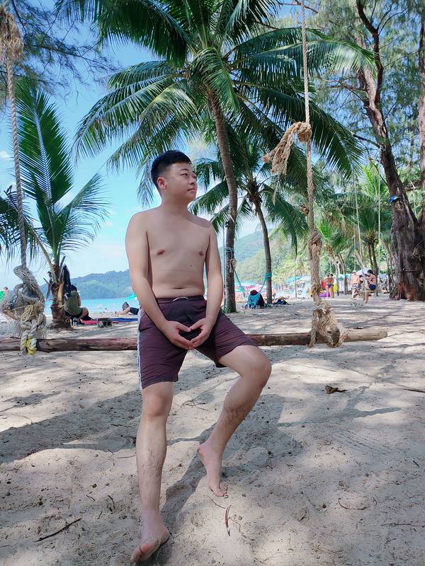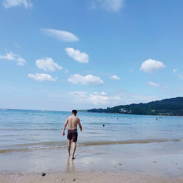 我们决定先去卡马拉海滩吃东西,拍照片。于是,便有了以下照片。海水很惊艳,确实比国内的蓝很多,我在三亚蜈支洲岛看到了国内最蓝的海,不过比起这个印度洋来说,逊色了不少。我只是踩踩水,而那人已经无法控制自己,下去水里泡着了。很开心在这特殊的日子里能踩到温水。普吉岛的外国游客很多,各种肤色都有。有的当然很养眼,有的也不想多看。不过我觉得偷拍不礼貌,更怕被发现。留着想象大家自己去看吧。