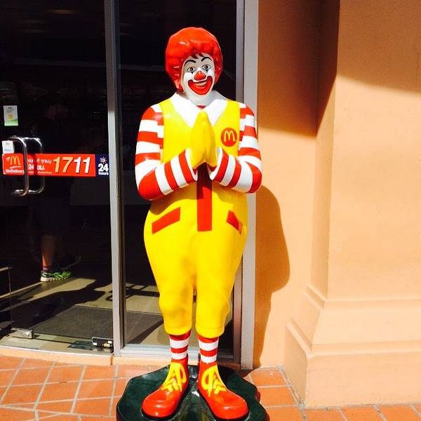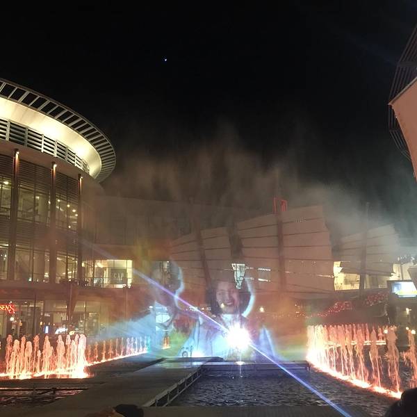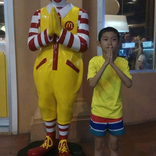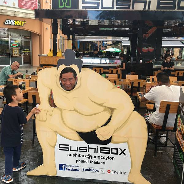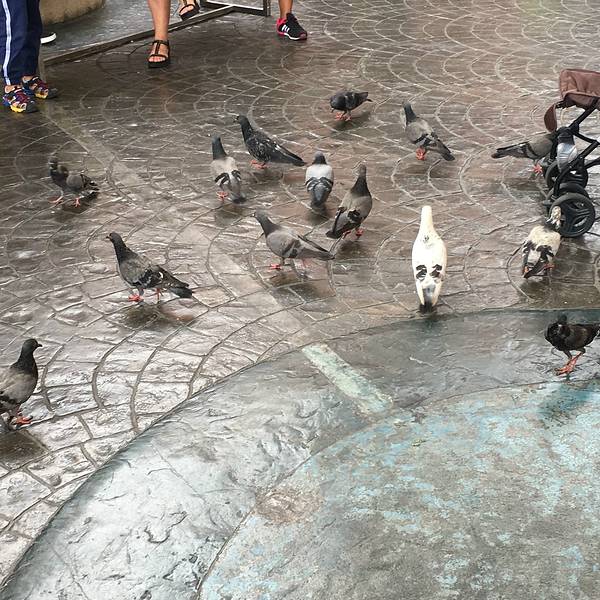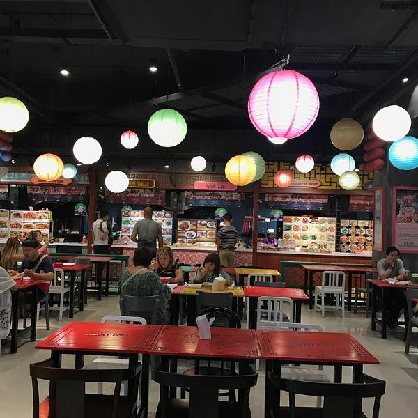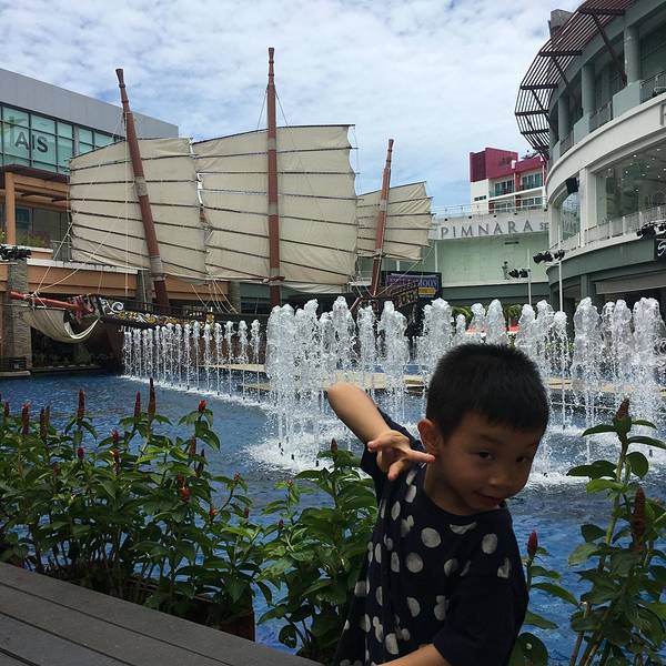接着我们兵分几路,有人带着三个熊孩子去儿童乐园玩,有人先去照吃的坐着等,有人去逛街,我跟妈妈就去Big C超市逛逛买了点手信。儿童天地能把消耗兄孩子们的时间和精力,不愧是好地方。其中一家拉面店门口有个大力士的招牌,粑粑和宝贝角色扮演玩得开心。难得摆下pose拍照。中庭的喷泉和大帆船挺不错的。很多不怕人的白鸽,成为一道风景。