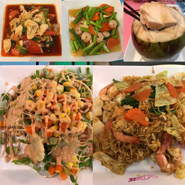 随后去班赞海鲜市场,1楼买海鲜、蔬菜、水果,在龙岛-小仙女摊位买了海鲜,澳龙1个、皮皮虾4只、梭子蟹1个,送了竹蛏、蛤蜊,开价3400泰铢,最后付了2000泰铢,买了2把空心菜,20泰铢,2楼找了F2-09摊位加工,加工费800泰铢,我感觉加工费贵了,好在烧的味道不错。龙虾一半焗油,一半蒜蓉,咖喱蟹、椒盐皮皮虾,葱姜爆炒蛤蜊、葱姜爆炒竹蛏,炒空心菜。还在2楼买了椰子50泰铢,西瓜冰沙50泰铢,芒果冰沙60泰铢,啤酒70泰铢。3个人吃撑了,决定最后一天再来吃一顿。