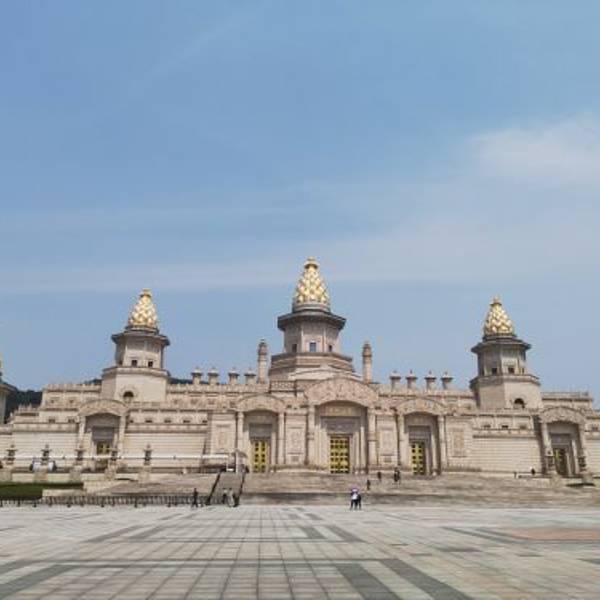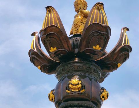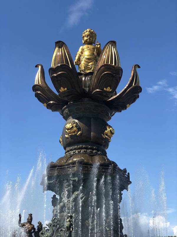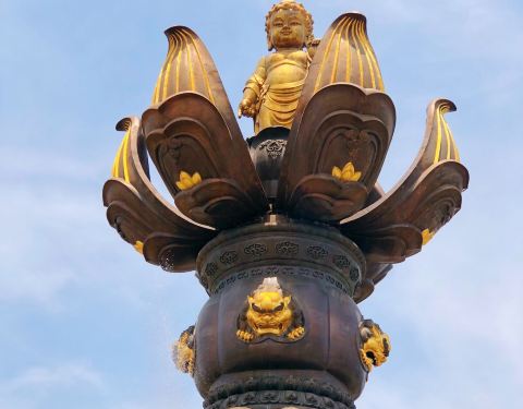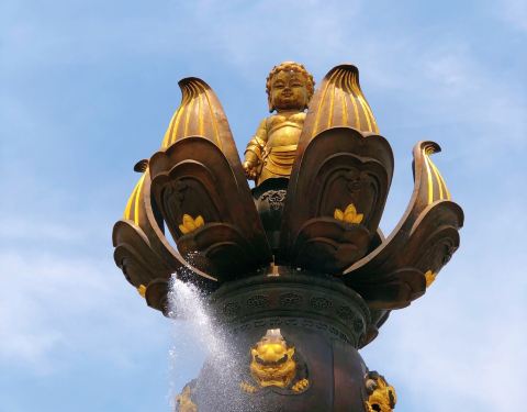 根据典籍《本行经》记载:佛祖一诞生就能说话会走路,他向东南西北四个方向各走了七步,每走一步,地上就开出一朵莲花。他一手指天,一手指地,说道:“天上天下,唯吾独尊”,这时候花园里忽然出现了两方池水,天空中出现九条巨龙,吐出水柱,为其沐浴净身。这个故事十分神奇,让人浮想联翩。 更难得的是,灵山胜境的大型音乐动态群雕“九龙灌浴,花开见佛”再现了故事中的绚丽景象。在九龙灌浴广场,我们可以看到一座含苞待放的巨大莲花铜雕矗立在前方,巨大的荷花由四个威武的大力士托起,底部衬托着白色的圆形大理石水池,九条飞龙和八个形态各异的供养人环绕着巨大的水池。