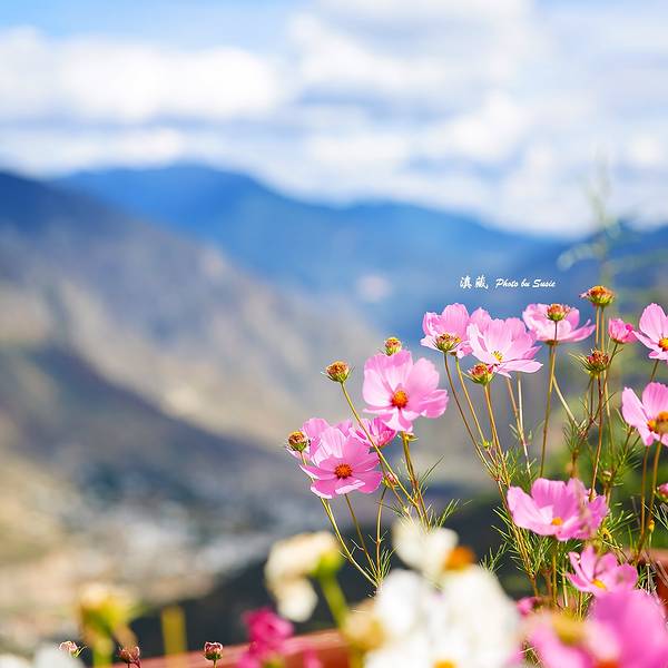 景区入口处的格桑花开得份外灿烂。金沙江大拐弯是国内四十大景观之一,