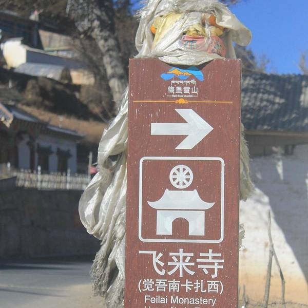 飞来寺位于距离德钦县城约10公里处的滇藏公路边,正对梅里雪山主峰卡瓦格博。距今已有380余年。事实上飞来寺本身是个很小的寺庙,平时只有一个喇嘛和一只猫还有一只大公鸡为伴。寺里有“中日梅里雪山登山勇士殉难”纪念碑和一座佛塔,纪念碑是为纪念1991年1月4日梅里雪山登山队的17名遇难登山队员而立,佛塔则是为了纪念十世班禅视察德钦所建,有兴趣的话可以前往看看、烧香祈福。 真正让飞来寺出名的是“日照金山”的景观,日出的时候,阳光洒在梅里主峰上,雪山仿佛放出金色的光芒,非常壮观。由于刚好位于滇藏线路边,这里又是观看梅里雪山“日照金山”景观的好位置,来这里观景、拍照的游客越来越多,于是人们在此建造饭店客栈,渐渐的这里成了滇藏线旁的一处游客集散地,人们开始把寺庙周围的村子称为飞来寺,寺院本身反而没那么多人知道了。 飞来寺村里有比较舒适的酒店,也有适合背包客的青年旅舍,适合不同类型的旅行者。飞来寺还有个观景台,可供游客拍照。拍“日照金山”并不一定非得进入观景台,国道边其他地方也可以拍到,或者你的房间正对梅里雪山的话,也就可以省下观景台的费用了。 “日照金山”并不是每天都能看到,夏气候较好,但雨水也较多,山峰很可能被云雾挡住。推荐观看时间是10-12月,这时是旱季,天气挺冷,但山上云雾比较少,看到的几率比较高。通常前一日下午到达飞来寺,在村里的旅馆住一晚,第二天清早看过日照金山后,包车前往西当村,然后徒步雨崩。