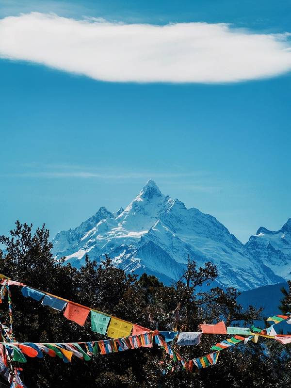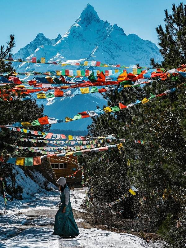 👉从出口进去往梅里雪见观景台走,大约30分钟就能到,这条路过去能够非常直观且近距离的欣赏缅茨姆峰,在经幡的映衬下,真的很出片!到达观景台后可以浅浅拍个照就往回走啦