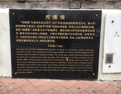 【疙瘩楼】不开放参观。 我和家人骑单车逛五大道,远远被其瓷片与疙瘩混搭的外装饰所吸引,停车驻足【疙瘩楼】五大道近代建筑群中最具代表性的一座楼。西沿河北路,北临睦南道,位于两街的交口处,为四层砖木结构西式楼房,具有浓郁意大利风格的连排式里弄住宅。 我和家人骑单车逛五大道,远远被其瓷片与疙瘩混搭...【疙瘩楼】五大道近代建筑群中最具代表性的一座楼。西沿河北路,北临睦南道,位于两街的交口处,为四层砖木结构西式楼房,具有浓郁意大利风格的连排式里弄住宅。 我和家人骑单车逛五大道,远远被其瓷片与疙瘩混搭的外装饰所吸引,停车驻足。 【疙瘩楼】不开放参观。著名京剧大师马连良曾在此居住,想想,当年的街坊邻居,一定是经常听马连良大师的吊嗓子与清唱小段,免费的……,我对疙瘩楼顿感仰慕。 展开