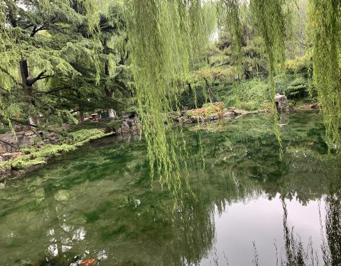 漱玉泉是进趵突泉公园里面后见到的第一眼有名的泉眼,而且此泉附近风景优美,因此合影的游人络绎不绝,即使我们是雨天冒雨游玩,也很难抢到拍照的好时机呀~所以想出好照片还是要早点来呀~漱玉泉跟后面的一个小池塘相连,池水碧绿,清澈见底,还有不少鱼儿在池子里自由自在地游来游去,真是快活!漱玉泉边种有很多数,特别突出的一棵挺拔的松树,看起来已经有一定的年头了呢,松树旁边立着一块石碑,上书“鸢飞鱼跃”,这是漱玉泉鼎盛时期的美景吧。我们是8月份的时候去的趵突泉公园,泉边的垂枝繁叶茂,垂在泉眼边,倒映在全眼里,真有一种穿越到江南的错觉。泉水潺潺流向小池塘,清澈见底。