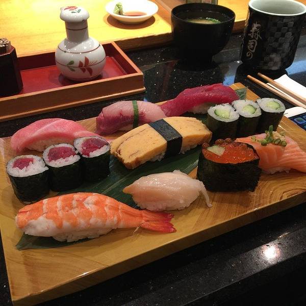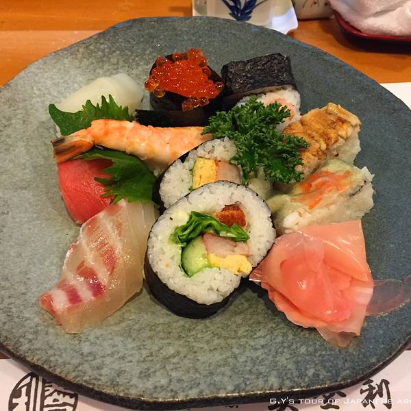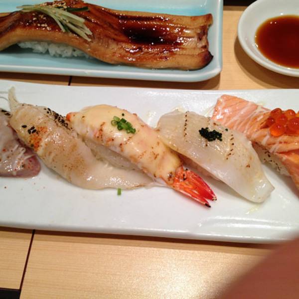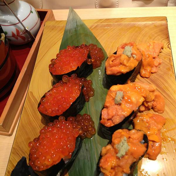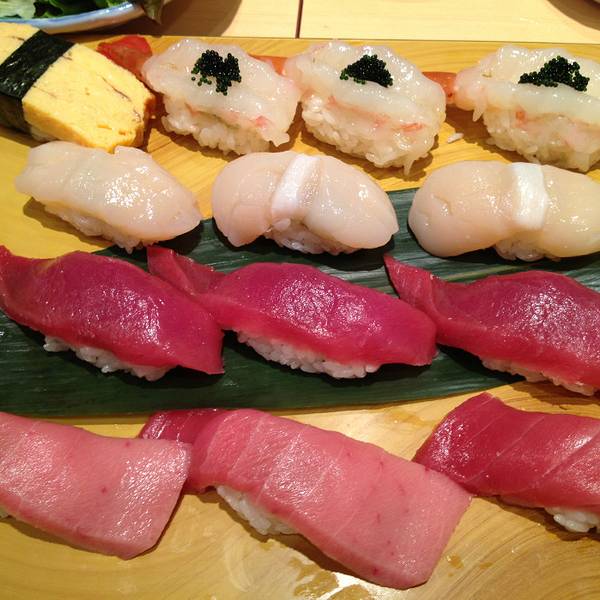 差不多7点同学就到了,我们进去吃寿司喽。我们不懂日语,对寿司也没啥研究,就交给同学啦。其实有一些套餐可以选择,但同学是单点的,真是点了不少!!!而且那个五个一排烤过的寿司可是每个人一份的哟,加上小酒三个人才11599日元,合700多人民币。这在北京吃个将太无二也这个价格吧,品质还不如人家这个好。老妈特别喜欢那个灰灰的蟹粉沙拉~~~那个虾肉做了寿司,虾头人家还给你烤了,直接吃掉!反正我和妈妈都觉得非常好吃,而且性价比相当高!!!!超级推荐!!!