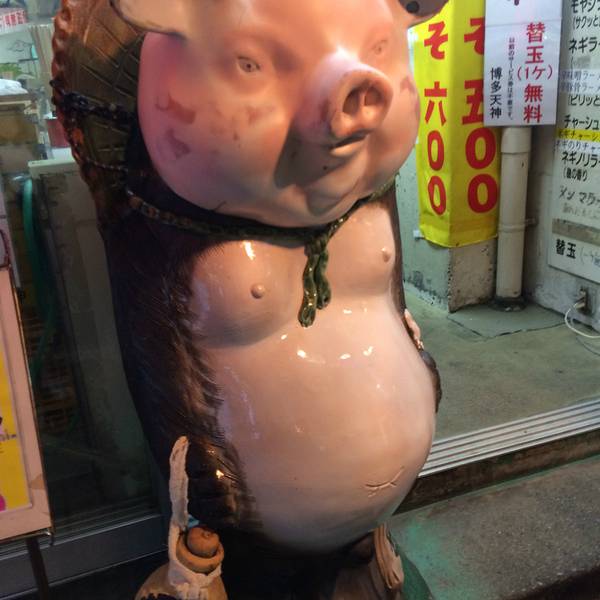 下面这只猪就是这家店的“吉祥物”了,立在门口很屌的样子。进店之后发现,是家挺不讲究的小破店,说不讲究是跟前一天的一风堂相比,感觉就像是繁华街道上的沙县小吃,但其实这也在另一方面彰显了他老字号的纯粹,不靠浮夸靓丽的外表来吸引游客,骨子里的傲娇和任性。里面的服务员是位欧巴桑,很麻利又有点厉害的样子,不过还是蛮热情的。