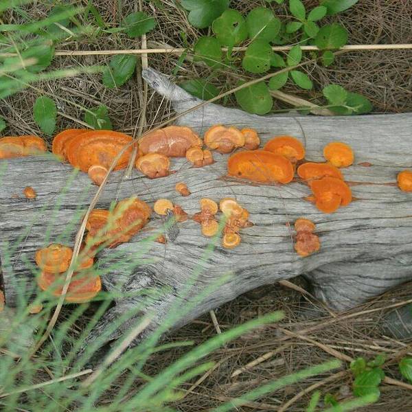 路上总是有这样的枯木长出美丽的菌类。