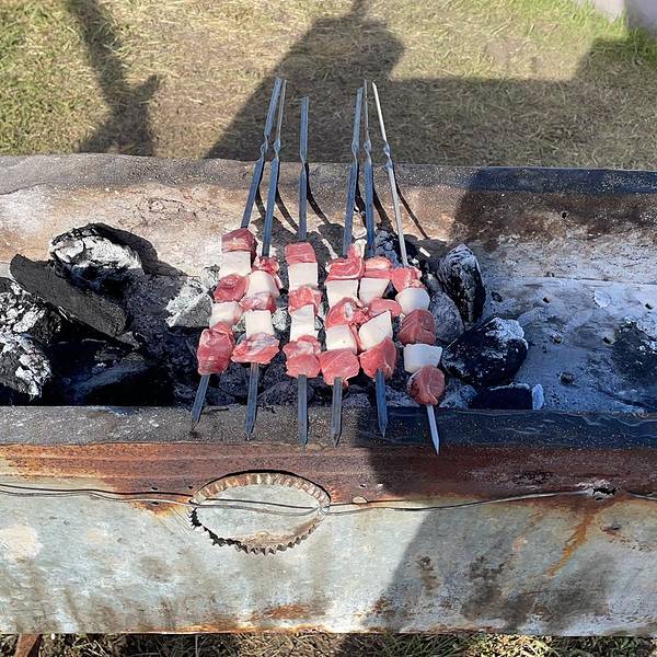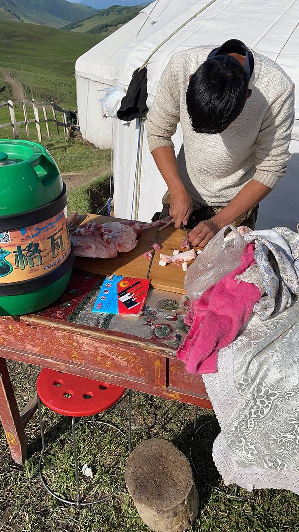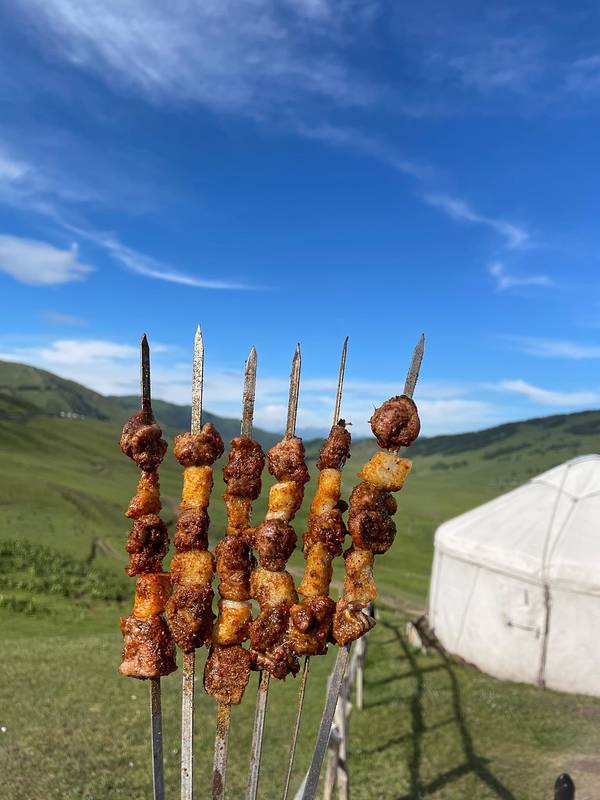 回布尔津的途中依旧是一路美景。路过贾登峪深林公园铭牌时有一家牧民,烤的羊肉串真的挺好吃,肉烤的很嫩还全熟了的,火候把握的相当精准。生活在这里的牛羊真是幸福现切现串开烤好吃的羊肉串 展开