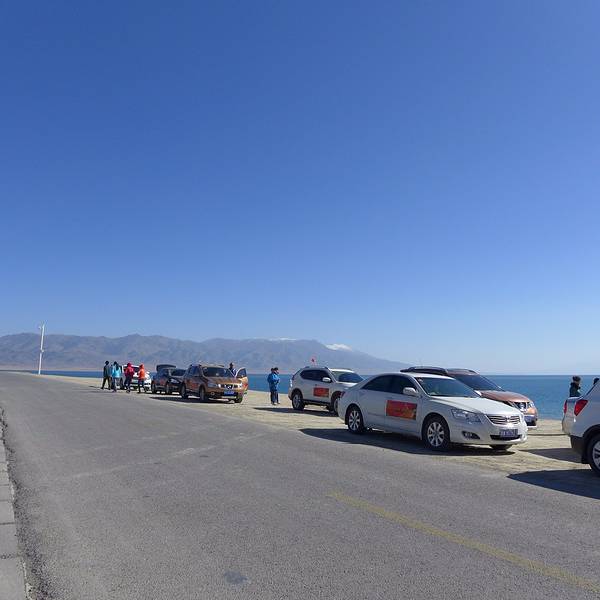 第一个景点,成吉思汗点将台。赛里木湖大约海拔2千多米,这里需要爬上去就能俯瞰赛里木湖第一个景点,成吉思汗点将台。赛里木湖大约海拔2千多米,这里需要爬上去就能俯瞰赛里木湖。逆光水波凌凌有车队自驾来玩,停靠就更加自由了沿途