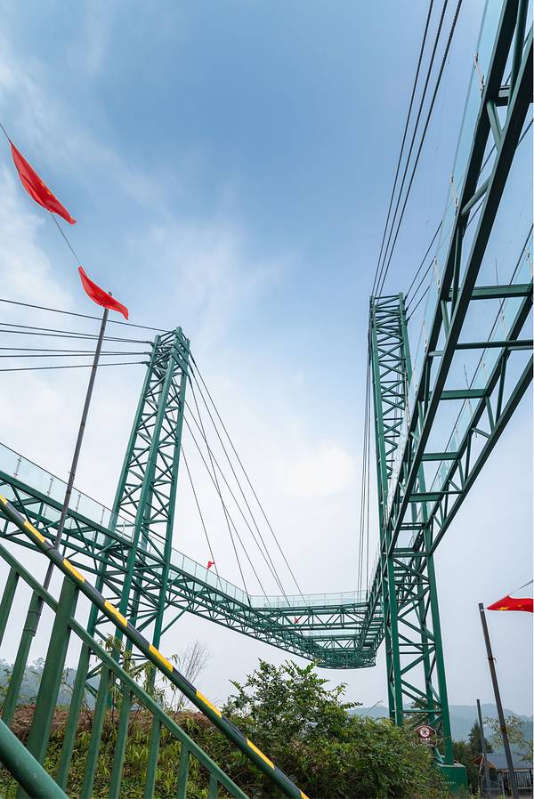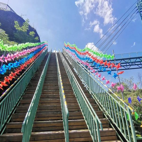 我们乘坐观光车来到了玻璃栈道景观平台。从下向上望去,那玻璃栈道形成了一个大大的A字。我想:可以站在上面浮望大地是一种什么的感觉呢?我不由得兴奋的起来,三步并作两步,一口气爬上了楼梯,直充平台顶峰。放眼望去、太美丽了