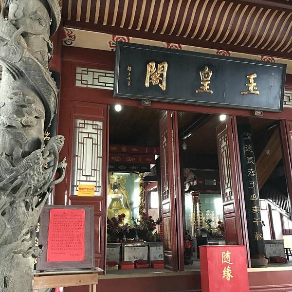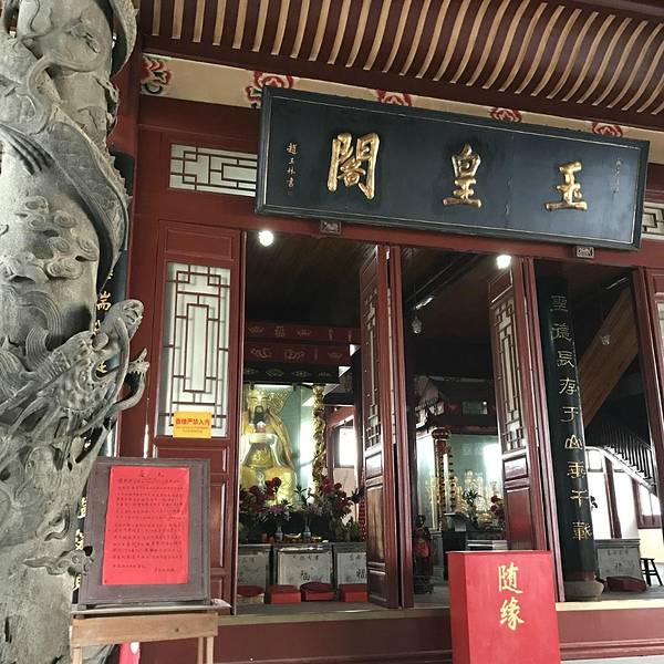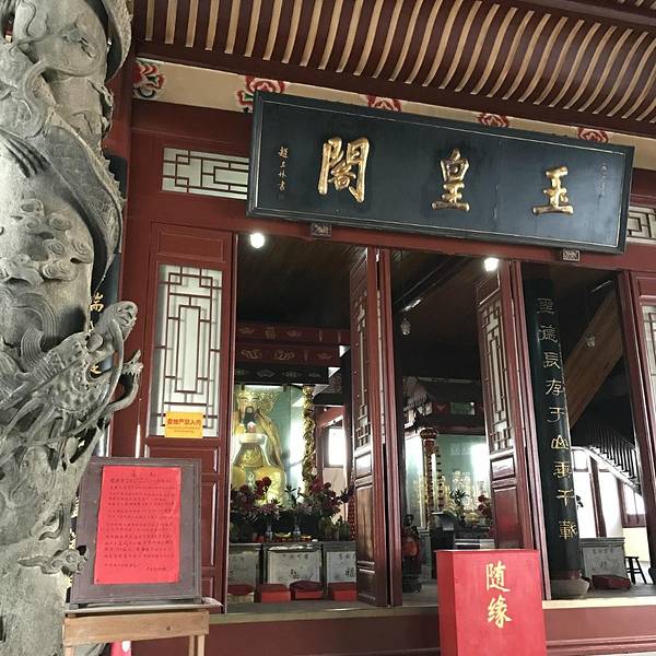 穿过天君殿,隔着一间有着六角五层藻井的拜亭,是一座双层楼阁,殿阁宏伟,建筑精巧,这是九仙观的后殿,称为“九仙阁”,又叫“玉皇阁”,阁内奉祀着玉皇大帝与何氏九仙,阁前的四根浮雕龙凤青石柱是清朝时期名匠的杰作。