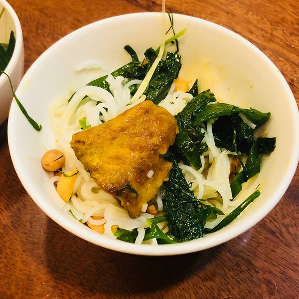 这个鱼怎么点?按人头的,也就是8美元一个人,当时旁边一对儿说法语的情侣,只想点一份,说我们吃的很少,还和服务员解释了好半天人家才答应。貌似这个菜的问题在于,无论几个人,鱼会加倍,菜可不会,所以我感觉我一个人吃真是赚了。服务员给我演示了如何把每个菜都加一些放进主食米线里的正确吃法。关键是加上那个鱼露和花生,配以煎鱼的小油腻,真的是……太香了!这让吃了我几天清淡菜系的我,岂不是泪流满面!就连我在咖啡店遇到的妹子,都对我能接受里面的小茴香很是惊奇。
