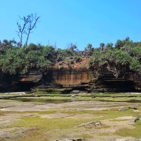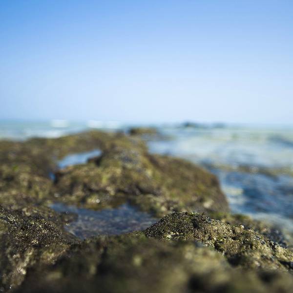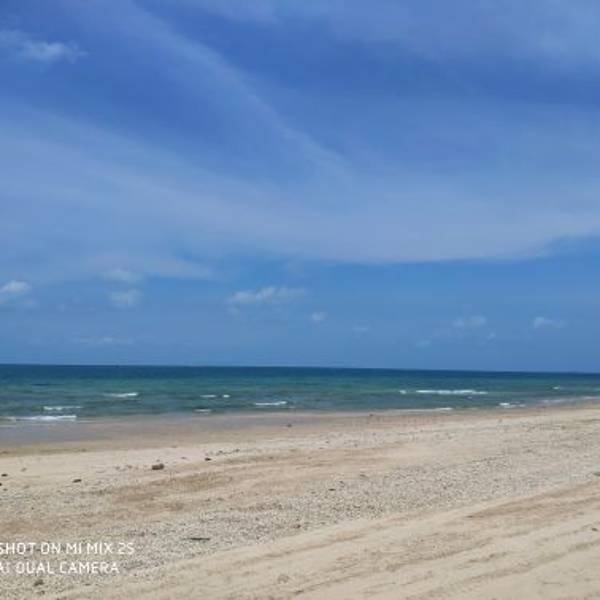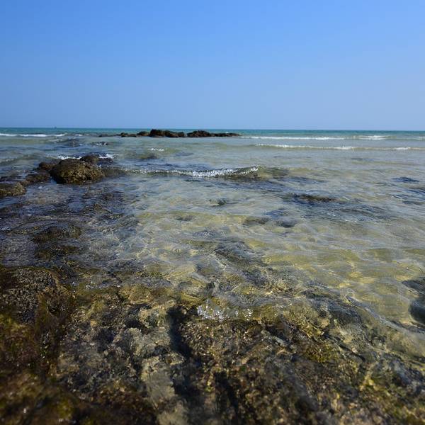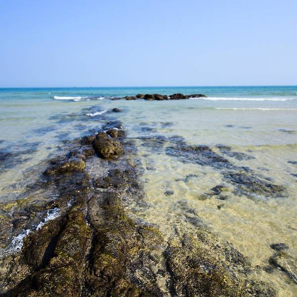 这边的海岸线特别的平缓,远处看过去海水是蓝绿色的,走到海边可以看见礁石,完成清晰可见,礁石上面附着一些贝壳海螺之类的生物。可以看见小孩子拉着小桶在这里捡贝壳。