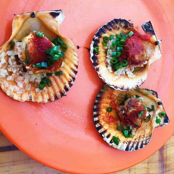 以前五彩滩没有暂停对外开放的时候是有海鲜烧烤的,现在目前没有了。不过石盘河村里有很多民宿的厨房都是对外开放的,可以在村子里吃,也可以自己买海鲜到民宿的厨房加工,给个加工费就好了,白灼十块,爆炒二十,非常好吃。