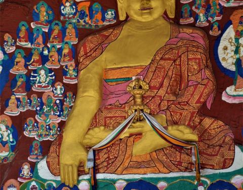 ...手摇转经筒,口诵六字真言心度虔诚地绕着药王山朝拜,把刻有六字真言的牛头,石块恭敬的置于山崖上面药王山藏名“夹波日”,意为“山角之山”,在布达拉宫右侧,海拔3725米。 药王山与布达拉宫咫尺相对,是拍摄布达拉宫最好的角度,尤其是半山腰。清晨的药王山,经常可见些许摄影爱好者汇集与此等待第一缕光线照...药王山藏名“夹波日”,意为“山角之山”,在布达拉宫右侧,海拔3725米。 药王山与布达拉宫咫尺相对,是拍摄布达拉宫最好的角度,尤其是半山腰。清晨的药王山,经常可见些许摄影爱好者汇集与此等待第一缕光线照亮布达拉宫的瞬间。 药王山的转经路上,朝圣的信徒手摇转经筒,口诵六字真言心度虔诚地绕着药王山朝拜,把刻有六字真言的牛头,石块恭敬的置于山崖上面。 药王山上的摩崖石刻在拉萨存在已久,最早源于松赞干布时代。经年累计使得整个药王山石刻造像长近千米,垂直的石壁上遍布彩色佛像,气势令人叹为观止。 展开