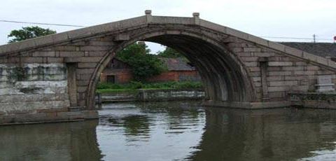 是一座非常高的拱桥,下面是一个圆拱,在流水的倒影下成一个完美的园,旁边还有柳树,非常的美丽,同...