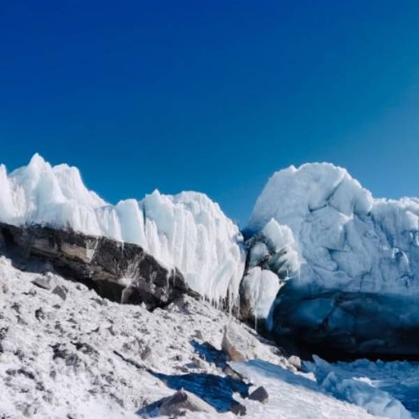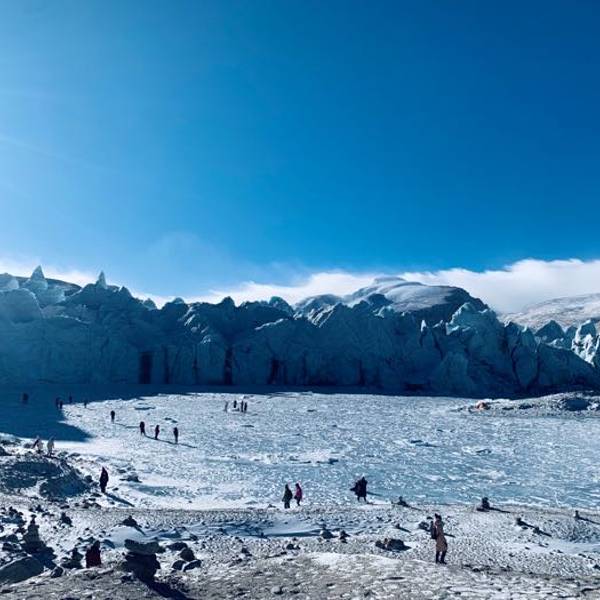 渐渐地卡若拉冰川展现在眼前,眼里蓝天白云间是雪白的冰川,洁白的冰川犹如一副巨型唐卡挂在山壁上。巨大的冰川从山顶一直伸展到离公路只有几百米的路边,晶莹幽蓝的冰川寒气迫人,加上冬天氧气稀薄,山口风超级大,仿佛来到了生命绝迹的天界尽头。呼吸仿佛都冻住了,厚厚的卡若拉冰川是那么的圣洁、美丽,也只有到现场,人才能真正体会到大自然的伟大,体会到人的渺小,体会到天人合一的境界。