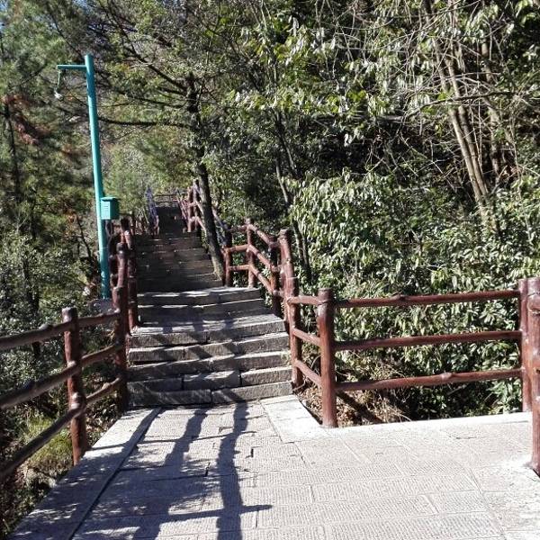 【个人感受】我们经过了迷魂台不远,继续前行,来到绝壁上面一处小平台。站在平台,举目远眺,只见视野之内是一条豁朗的山谷,有十几座石峰分布其中,谷间花木茂盛,流水淙淙,百鸟鸣啼,加上微微雾气,风景有如山水画,座座山峰有如直立的天兵天将,又像是微缩的盆景景观,十分有意思。