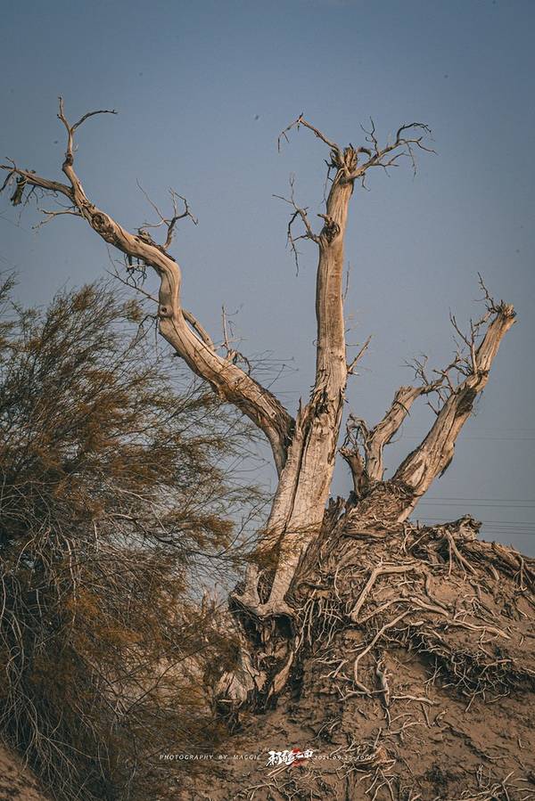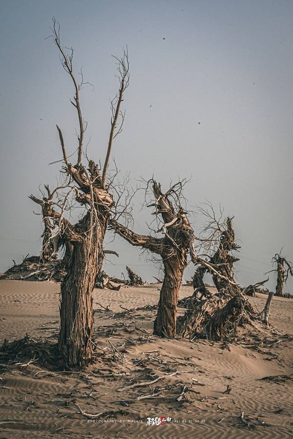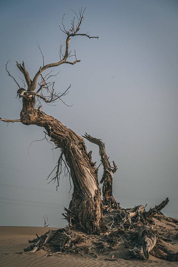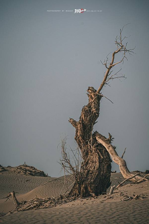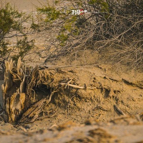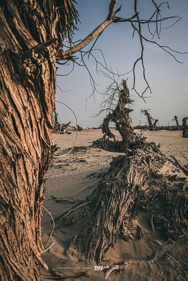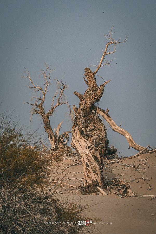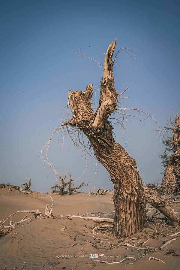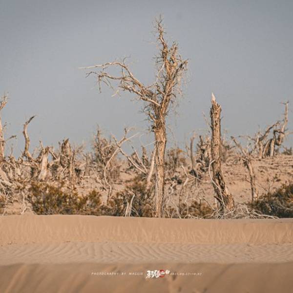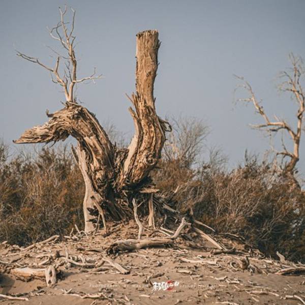 从景区开过来没啥准确定位,但是基本上过了 塔里 木河,往前开30公里左右,就看到一大片死胡杨林在路边的沙丘上。胡杨它耐寒、耐旱、耐盐碱、抗风沙,有很强的生命力,是当今世界上最古老的杨树品种,被誉为“活着的化石树”。所以有人这样赞扬胡杨,“生而不死一千年,死而不倒一千年,倒而不朽一千年,三千年的胡杨”。