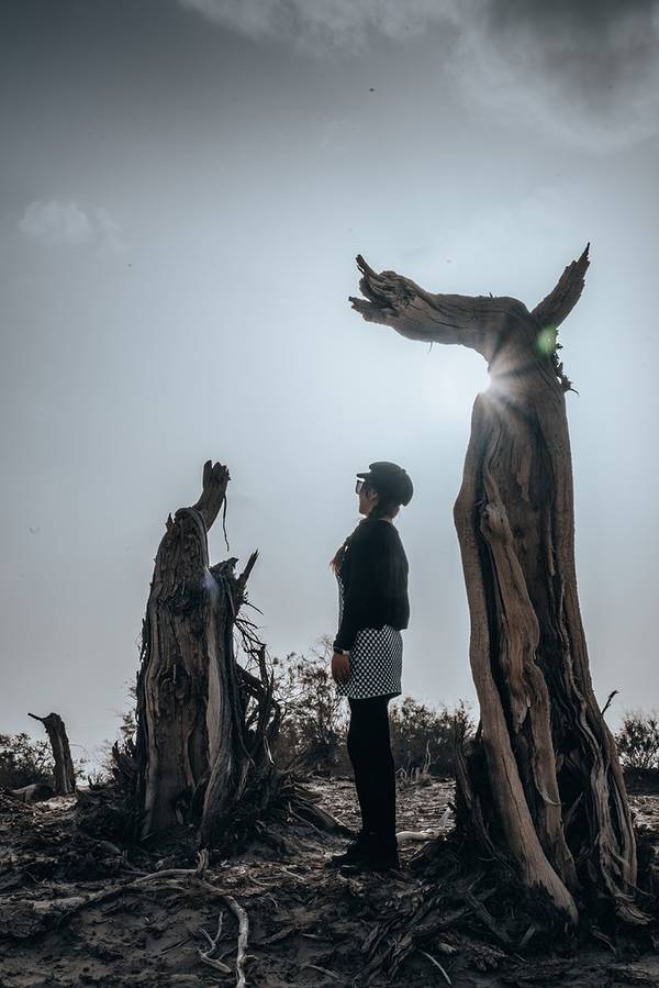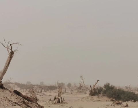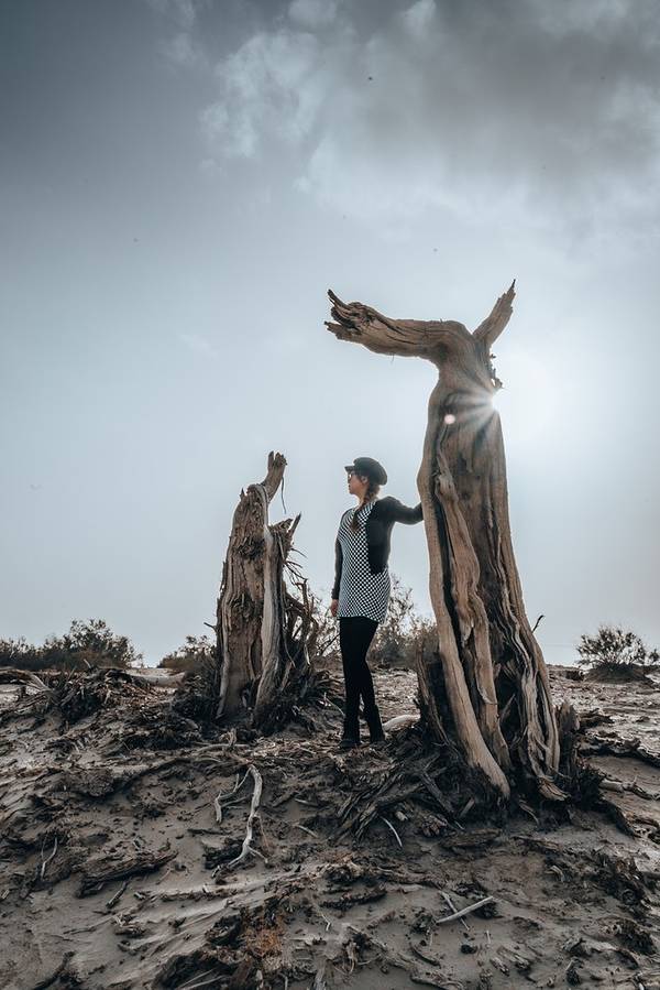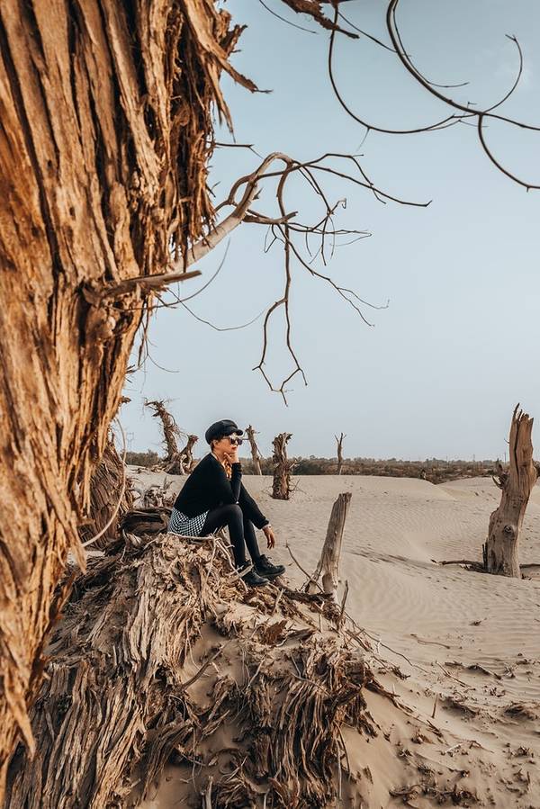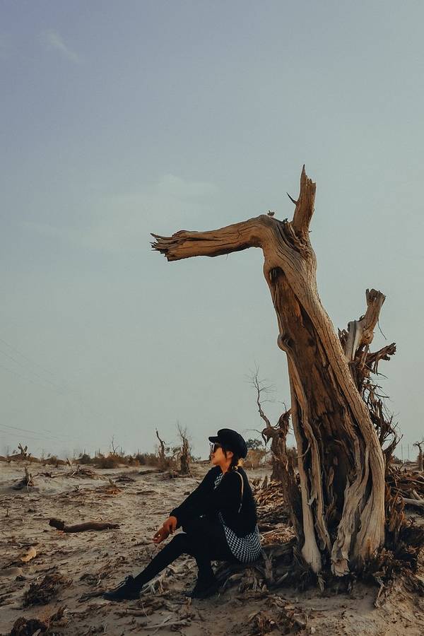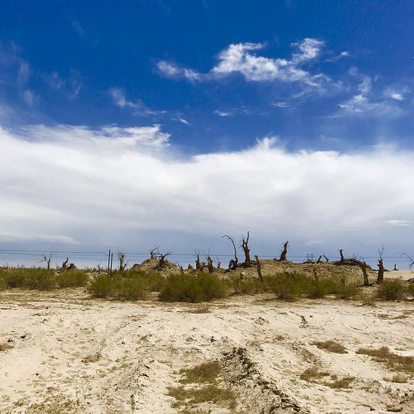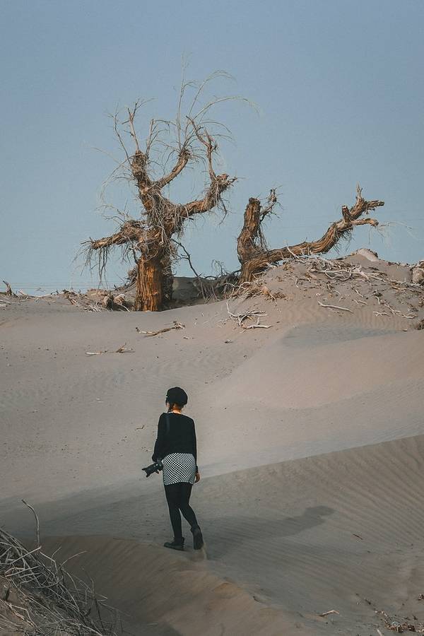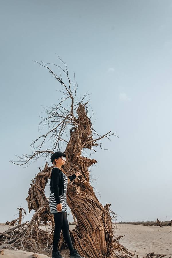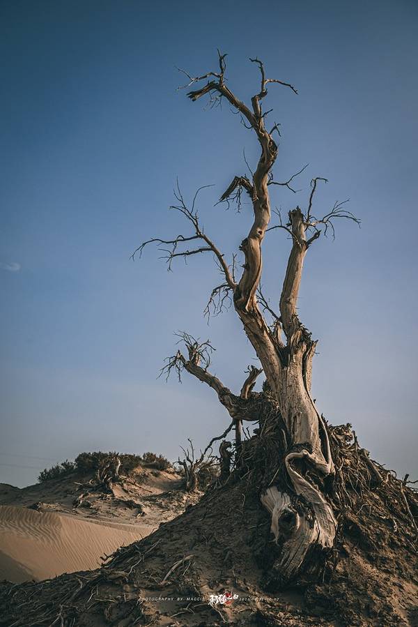从景区开过来没啥准确定位,但是基本上过了 塔里 木河,往前开30公里左右,就看到一大片死胡杨林在路边的沙丘上。胡杨它耐寒、耐旱、耐盐碱、抗风沙,有很强的生命力,是当今世界上最古老的杨树品种,被誉为“活着的化石树”。所以有人这样赞扬胡杨,“生而不死一千年,死而不倒一千年,倒而不朽一千年,三千年的胡杨”。
