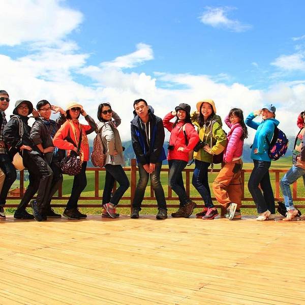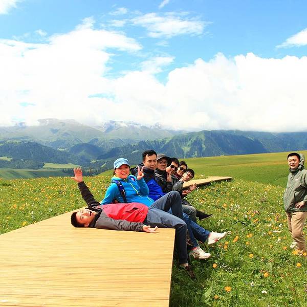 来自广州还是广东的易辉,第一次见面觉得冷冷的,等熟悉后,待他充上电,逗比属性无疑了。这张照片今日再看,明显的过爆。但景色的美不关照片照的好不好我相信大家都能看得到。 我还记得这里,有成片成片的小黄花,有大朵大朵的白云镶嵌在蓝色的绸布上。有一群笑脱了的小伙伴。小灰灰没有入镜,先来看逗比的我们吧