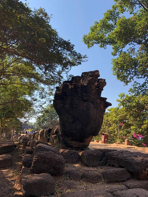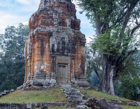 巴空寺位于暹粒市区以东约13公里处,是罗洛士群里规模大、重要的寺庙,也是高棉王国迁都吴哥通王城之前的国寺,用以供奉湿婆和林迦。它曾变为废墟,后来被大致修复了原貌,在五层方形金字塔平台的顶层中心矗立着一座五层宝塔。巴空寺远离暹粒市区,属于吴哥窟的“外圈”游览路线。很多人选择在傍晚到此,因为夕阳西下时沧桑的庙宇与绿树鲜花交映的景色格外令人着迷。寺庙被三面同心墙和一条护城河所包围,但远远地就能看到庙山上的宝塔。通过长长的步道来到东边的入口,北侧是一个新建的佛教寺院,与残破的巴空寺遗迹形成鲜明对比。许多僧人会在这里传经,并在周围种植了大量的草本花木。走进巴空寺,宏伟的寺前广场上堆砌着许多乱石,荒草丛生,你可以找到残留的林迦及湿婆坐骑的雕像,不过已经面目全非。在庙山主体之外还有多座砖造的卫星寺塔,大多也残缺不全。靠近庙山主体,仰望高耸在顶端的宝塔,十分雄伟。从底层的石门进入,便可以攀爬阶梯走上五层平台,这五层分别代表那迦、迦鲁达、夜叉、罗刹和神的世界。在阶梯的两侧可以看到石狮子,但有些没有了头部,尽显沧桑。而平台的四角竖立着神象石雕,可惜也已不完整,连鼻子都不见了。在第四层平台上是围绕在中央宝塔四周的矮塔,有些部分还保留着初的石膏浮雕。来到顶层的中央宝塔前,你可以好好欣赏一番塔身上的仙人浮雕,虽然残缺得很严重、修复痕迹明显,但依然能感受到当时精湛的雕刻工艺。站在庙山的顶端俯瞰整座寺庙,可以了解它大致的布局。