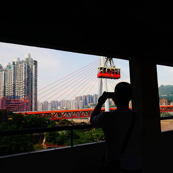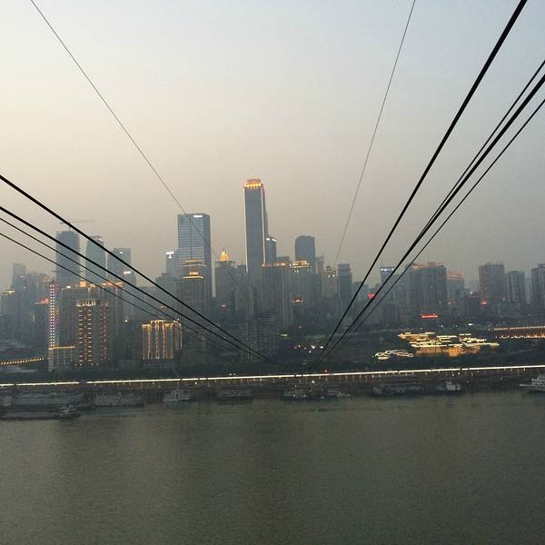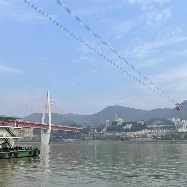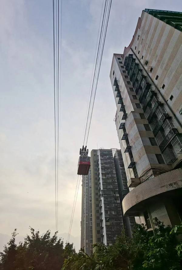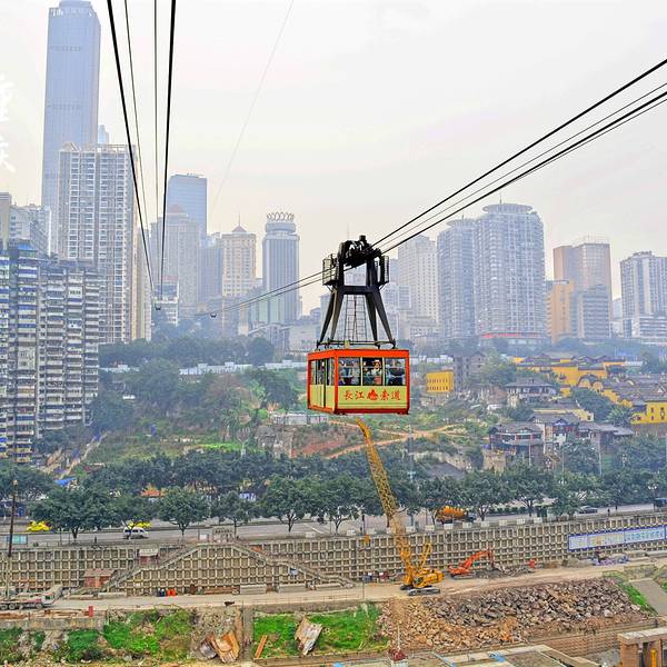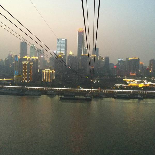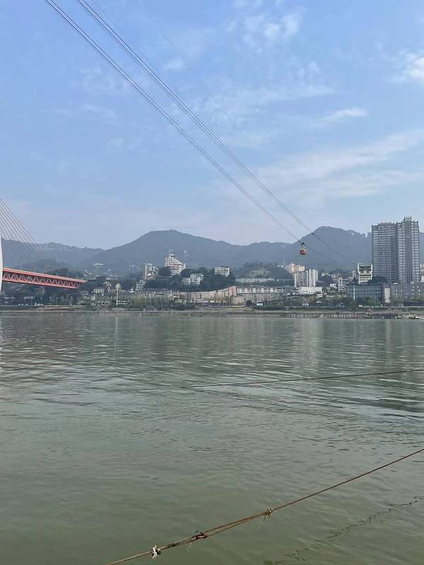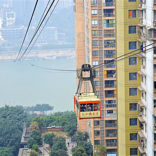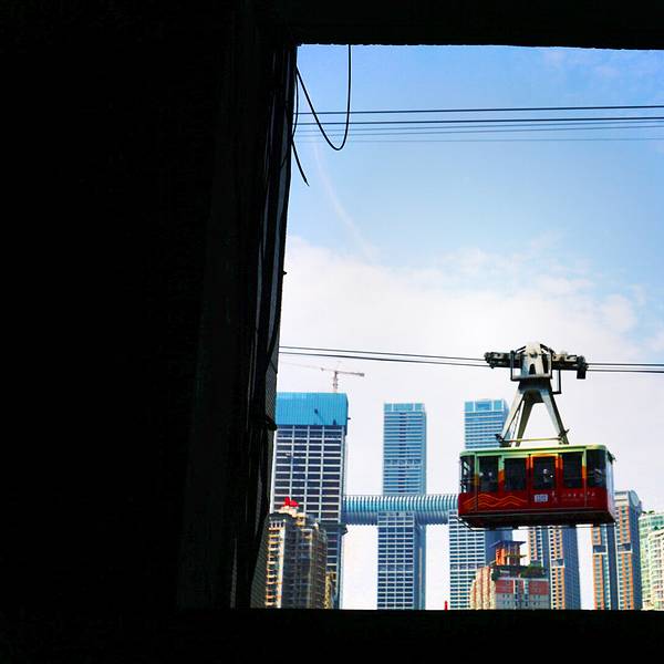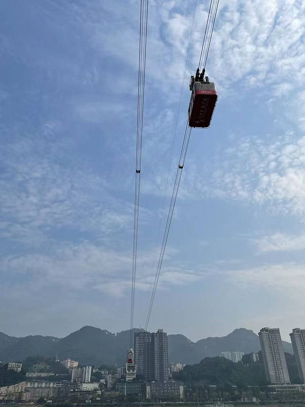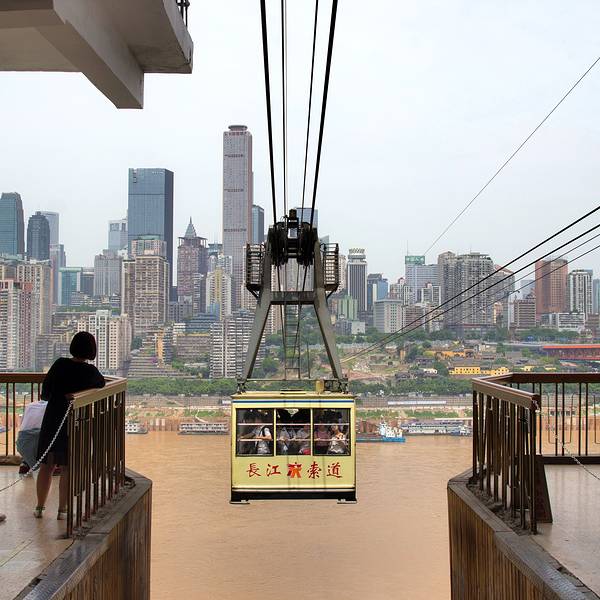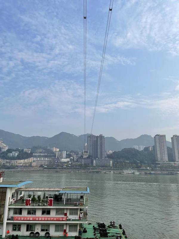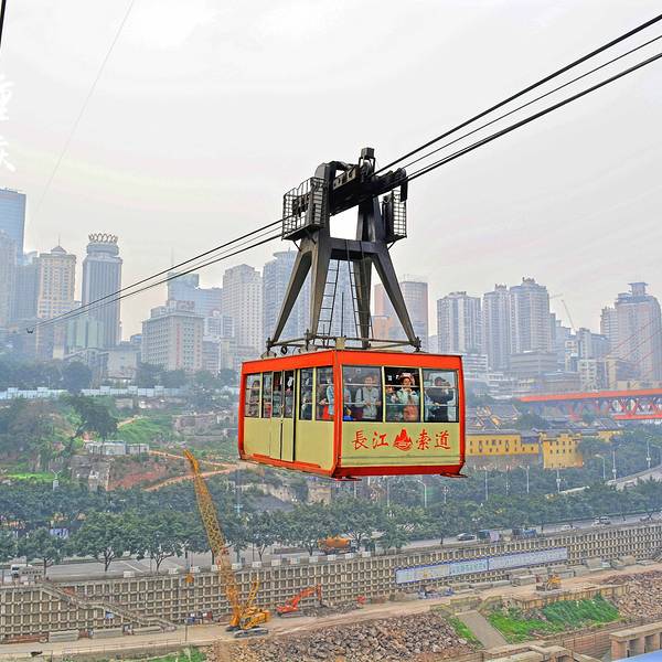 乘坐索道从空中滑向长江对岸,沿途欣赏山城的钢筋森林和两岸景色。