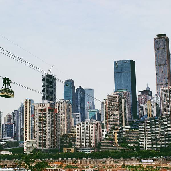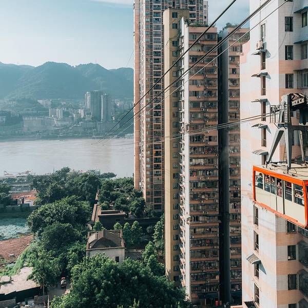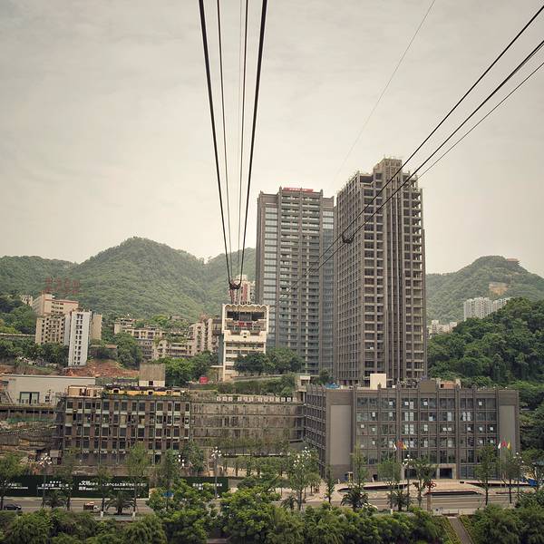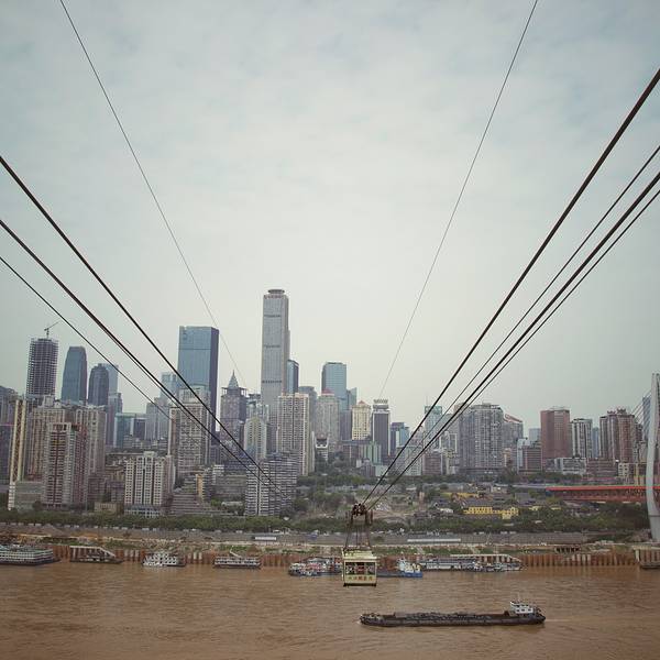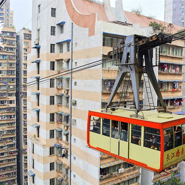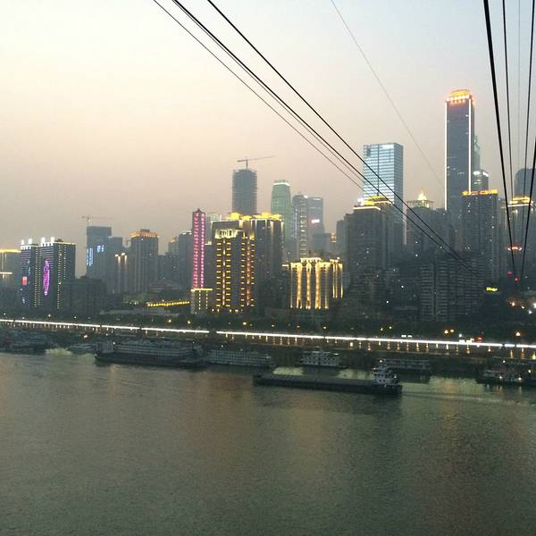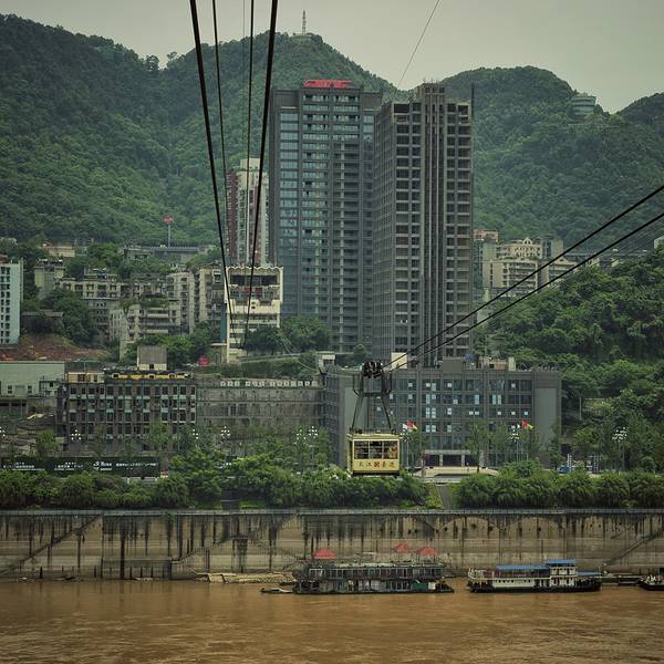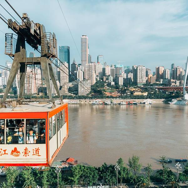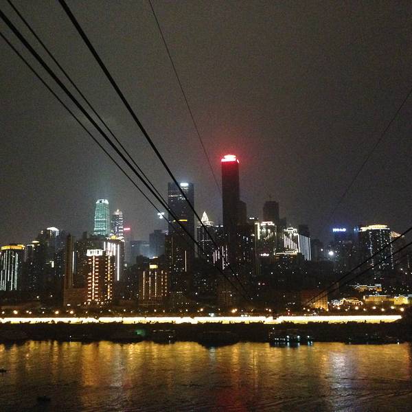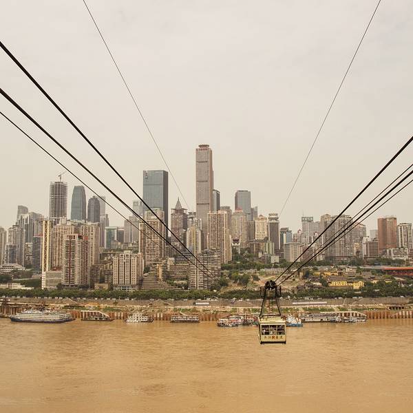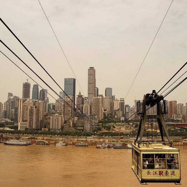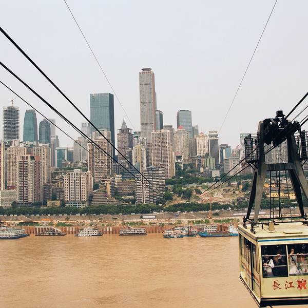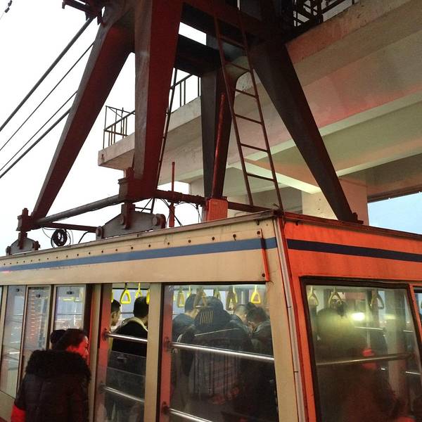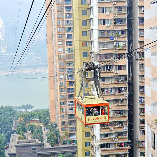 乘坐索道从空中滑向长江对岸,沿途欣赏山城的钢筋森林和两岸景色。