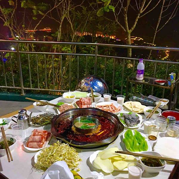 其实我们是想去对面一棵树那边的枇杷园吃火锅,是去磁器口一家卖火锅特产的老板娘介绍我们去的,我们到了长江索道对面还要坐黑车才能去到,五个人一起60RMB,要二十分钟左右,去到枇杷园真的很震撼,半座山都是火锅,有1000多桌,但是火锅一般