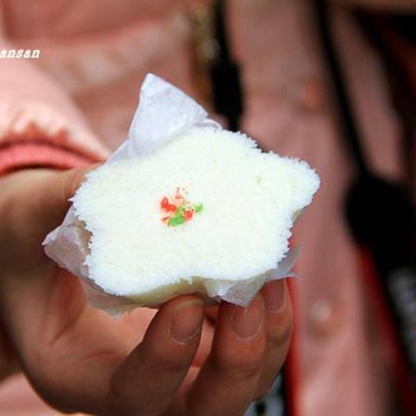 找到这家口碑很好的江南水乡小吃店咯!吃到赫赫有名的定胜糕啦! 2元钱一小个,里面是豆沙。